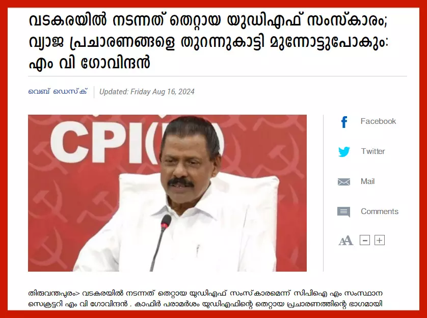 സിപിഎം സംസ്ഥാന സെക്രട്ടറി എം.വി ഗോവിന്ദന് മാസ്റ്റര് പാര്ട്ടിക്കെതിരായ എല്ലാ ആരോപണങ്ങളും തള്ളി. സ്ക്രീന്ഷോട്ടിനു പിന്നില് യുഡിഎഫാണെന്ന് അദ്ദേഹം തിരുവനന്തപുരത്ത് നടന്ന പത്രസമ്മേളനത്തില് പറഞ്ഞു: വടകരയില് നടന്നത് തെറ്റായ യുഡിഎഫ് സംസ്കാരം. കാഫിര് പരാമര്ശം യുഡിഎഫിന്റെ തെറ്റായ പ്രചാരണത്തിന്റെ ഭാഗമായി വന്നതാണ്. വടകരയില് ആദ്യം മുതല് ഉണ്ടായ സംഭവങ്ങള് വിശകലനം ചെയ്യണം. ഒറ്റപ്പെട്ട സംഭവമായി വിഷയത്തെ ചുരുക്കി കാട്ടാനാണ് ശ്രമിക്കുന്നത്. ആദ്യം നടന്നത് ടീച്ചര്ക്കെതിരേ 'ടീച്ചറമ്മ' എന്ന പേരിനെ പരിഹസിച്ചുള്ള പ്രചാരണമാണ്. വ്യക്തിപരമായ അശ്ലീല അധിക്ഷേപമാണ് ഉണ്ടായത്. അതിന് പിന്നാലെയാണ് ഓരോന്നോരോന്നായി പ്രചരിപ്പിച്ച് തുടങ്ങിയത്. മുസ്ലിംകള് തീവ്രവാദികളാണ് എന്ന് ശൈലജ ടീച്ചര് പറഞ്ഞുവെന്നാണ് പിന്നീട് പ്രചരിപ്പിച്ചത്. ലൗ ജിഹാദ് നിലനില്ക്കുന്നതായി ശൈലജ ടീച്ചര് പറഞ്ഞുവെന്ന് പ്രചരിപ്പിച്ചു. പിന്നീട് പാനൂര് സ്ഫോടനക്കേസിലെ പ്രതികളുമായി നില്ക്കുന്ന ഫോട്ടോ വ്യാജമായി പ്രചരിപ്പിച്ചു. തെറ്റായ വാര്ത്തയുടെ പ്രചാരണം എഐ സംവിധാനത്തോടെ കൂടുതല് സജീവമായി. തെരഞ്ഞെടുപ്പ് പ്രചാരണ രംഗങ്ങളില് ഇത്തരം പ്രചാരണം നടക്കുന്നുണ്ടെന്ന് സിപിഐ എം ചൂണ്ടികാട്ടിയിട്ടുണ്ട്. ഇത്തരം വ്യാജ പ്രചാരണങ്ങളെ തുറന്നുകാട്ടി മുന്നോട്ടുപോകും. ന്യൂനപക്ഷ-ഭൂരിപക്ഷ വര്ഗീയതക്കെതിരായ നിലപാട് എക്കാലത്തും സിപിഐ എം തുടര്ന്നുപോകും. ജമാഅത്തെ ഇസ്ലാമിയുടെയും, എസ്ഡിപിഐയുടെയും കൂട്ടുകക്ഷികളെ പോലെയാണ് കോണ്ഗ്രസും ലീഗും പ്രവര്ത്തിച്ചത്. തെരഞ്ഞെടുപ്പ് പ്രചാരണത്തിന്റെ ആദ്യഘട്ടം മുതല് അശ്ലീലവും വര്ഗീയവുമായ വ്യാജപ്രചാരണമാണ് നടന്നത്. വിഷയത്തില് ആദ്യം പരാതി നല്കിയത് എല്ഡിഎഫ് തെരഞ്ഞെടുപ്പ് കമ്മിറ്റിയാണ്. പോരാളി ഷാജിയും സോഷ്യല് മീഡിയ ഗ്രൂപ്പുകളും ഇടതുപക്ഷം അല്ല. അത്തരം ആളുകളുടെ സഹായം സിപിഐ എമ്മിന് ആവശ്യമില്ല. ഇത്തരം ഗ്രൂപ്പുകളെ സിപിഐ എം നേരത്തെ തന്നെ തള്ളിപ്പറഞ്ഞതാണ്. (ദേശാഭിമാനി, ആഗസ്റ്റ് 16, 2024)