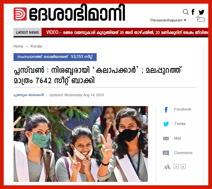മലബാറിലെ പ്ലസ് വണ് സീറ്റിന്റെ അപര്യപ്തത വലിയ ചര്ച്ചയായ സംഭവമാണ്. ഈ കോളത്തിലും അതേക്കുറിച്ച് ചര്ച്ചചെയ്തിരുന്നു. നീണ്ട സമരങ്ങള്ക്കൊടുവില് കുറച്ച് സീറ്റുകള് അനുവദിച്ച് ഉത്തരവായി. പ്ലസ് ടു പ്രവേശനം പൂര്ത്തിയാക്കിയ ശേഷം ആഗസ്റ്റ് 14ന് ദേശാഭിമാനി ഒരു വാര്ത്ത പ്രസിദ്ധീകരിച്ചു. 'പ്ലസ് വണ്: നിശബ്ദരായി 'കലാപക്കാര്'; മലപ്പുറത്ത് മാത്രം 7642 സീറ്റ് ബാക്കി'. പ്ലസ് വണ് സീറ്റ് ആവശ്യത്തിനുവേണമെന്ന് ആവശ്യമുയര്ത്തിയവരെയാണ് ദേശാഭിമാനി കലാപക്കാരാക്കി മാറ്റിയത്: സീറ്റിന്റെ പേരില് അനാവശ്യ കലാപമുണ്ടാക്കിയവരെ നിശബ്ദരാക്കി ഹയര്സെക്കന്ഡറി ഒന്നാം വര്ഷ പ്രവേശനനടപടികള് പൂര്ത്തിയായി. 53,253 സീറ്റുകളാണ് സംസ്ഥാനത്ത് ഒഴിഞ്ഞുകിടക്കുന്നത്. സര്ക്കാര്, എയ്ഡഡ്, അണ് എയ്ഡഡ് സ്കൂളുകളിലായി ഈ വര്ഷം 3,88,634 പേര് പ്രവേശിച്ചു. മൊത്തം 4,66,071 അപേക്ഷകരില് 44,410 വിദ്യാര്ഥികള് ഒന്നിലധികം സീറ്റുകളിലേക്ക് അപേക്ഷിച്ചവരായിരുന്നു (ദേശാഭിമാനി, ആഗസ്റ്റ് 14, 2024).