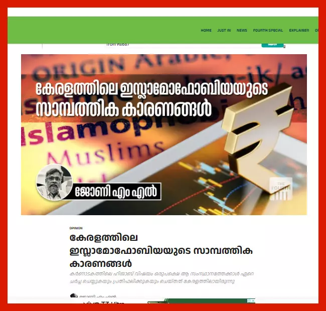 ഇസ്ലാമോഫോബിയയുടെ സാമ്പത്തിക കാരണങ്ങളിലേക്ക് കണ്ണയക്കുന്ന ശ്രദ്ധേയമായൊരു ലേഖനമാണ് ജോണി എം.എല്, ദി ഫോര്ത്തില് എഴുതിയ 'കേരളത്തിലെ ഇസ്ലാമോഫോബിയയുടെ സാമ്പത്തിക കാരണങ്ങള്'. (ആഗസ്റ്റ് 3, 2024). മുസ്ലിം സമൂഹത്തോടുള്ള അസൂയയാണ് ഹിന്ദു സമൂഹത്തിന്റെ ഇസ്ലാമോഫോബിയയുടെ കാരണമായി അദ്ദേഹം കണ്ടെത്തുന്നത്.