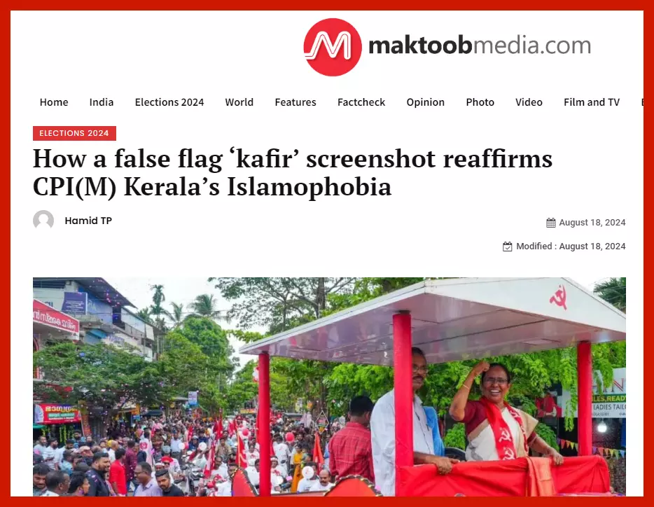 കാഫിര് വിവാദം കേരളീയ ഇസ്ലാമോഫോബിയയുടെ ബലതന്ത്രങ്ങളെ പുറത്തുകൊണ്ടുവന്ന സംഭവമാണ്. തെരഞ്ഞെടുപ്പിന് മുമ്പ് തുടങ്ങുകയും അതുകഴിഞ്ഞ് മാസങ്ങള് പിന്നിട്ടിട്ടും ദുരൂഹതയുടെ പുകപടലങ്ങള് വമിപ്പിക്കുകയും ചെയ്തുകൊണ്ടിരിക്കുന്ന ഈ ദുരന്തത്തിന്റെ ചരിത്രവും പ്രത്യയശാസ്ത്രവും പരിശോധിക്കുന്ന ഹാമിദ് ടി.പിയുടെ കുറിപ്പ് മഖ്ദൂബ് മീഡിയ പ്രസിദ്ധീകരിച്ചു How a false flag 'kafir' screenshot reaffirms CPI(M) Kerala's Islamophobia (ആഗസ്റ്റ് 18, 2024, മഖ്തൂബ് മീഡിയ). കാഫിര് പ്രയോഗത്തിന്റെ ഇസ്ലാമിക ധാരണയും അതിനെ വികലമായി അവതരിപ്പിക്കുന്നവരുടെ വംശീയധാരണയും ലേഖനം പരിശോധിക്കുന്നുണ്ട്.