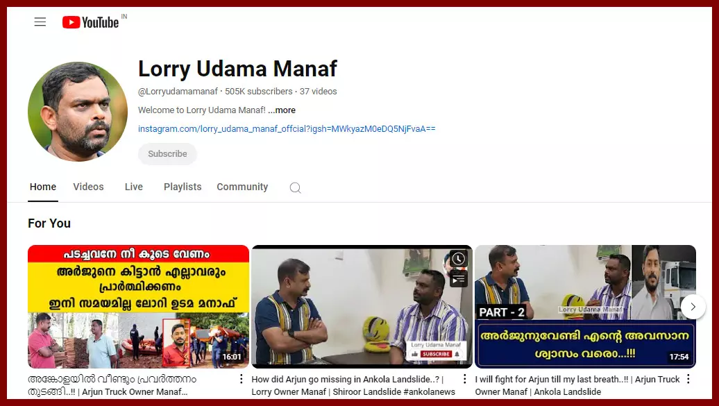 മനാഫിന്റെത് നാടകമാണെന്ന ആരോപണവും ചിലര് ഉയര്ത്തി. മനാഫിന്റെ യുട്യൂബ് അണ്സബ്സ്ക്രൈബ് ചെയ്യാനും ചിലര് ആവശ്യപ്പെട്ടു. പക്ഷേ, വെറും പതിനായിരം പേര് മാത്രം സബ്സ്ക്രൈബ് ചെയ്തിരുന്ന ലോറി ഉടമ മനാഫ് എന്ന ചാനല് ഈ കുറിപ്പ് തയ്യാറാക്കുമ്പോള് 5.03 ലക്ഷം സബ്സ്ക്രൈബേഴ്സുമായി മുന്നേറുകയാണ്. (ലോറി ഉടമ മനാഫ്, യുട്യൂബ് ചാനല്, ഒക്ടോബര് 10, 2024)