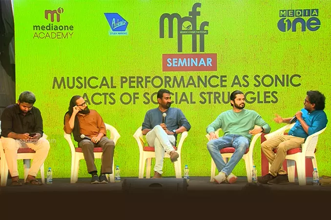 |സംഗീതം ശ്രോതാക്കളെ ത്രസിപ്പിക്കുമ്പോള് രാഷ്ട്രീയം ഉച്ചത്തില് പാടുന്നു. സാധാരണക്കാരന്റെ ഭാഷയിലൂടെ അവനുള്ക്കൊള്ളുന്ന രാഷ്ട്രീയഗതിയെ പാടികേള്പ്പിക്കുകയാണ് ഇന്നത്തെ പല പാട്ടുകളും. ജനങ്ങളുമായി നല്ല രീതിയില് സംവദിക്കാന് സംഗീതം കൊണ്ട് സാധിക്കും. അത് പ്രണയം മുതല് പ്രതിരോധം വരെ. ജനകീയ പ്രതിരോധങ്ങളും സംഗീത ആവിഷ്കാരങ്ങളും എന്ന തലക്കെട്ടില് മീഡിയ വണ് അക്കാദമി ഫിലിം ഫെസ്റ്റിവെലില് നടന്ന സെമിനാര്.