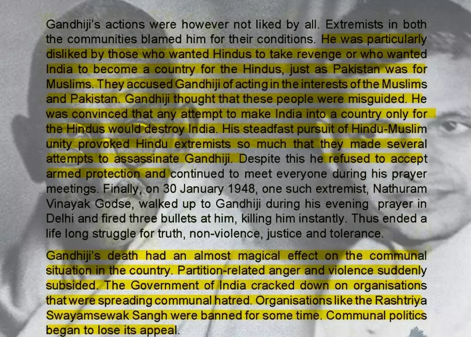 |ചരിത്ര പാഠപുസ്തകത്തിന്റെ മൂന്നാം ഭാഗത്തിലെ 'മഹാത്മാഗാന്ധിയും ദേശീയ പ്രസ്ഥാനവും' എന്ന അധ്യായത്തില് നാഥുറാം ഗോഡ്സെയെകുറിച്ചുള്ള 'തീവ്ര ഹിന്ദു പത്രത്തിന്റെ എഡിറ്റര്' എന്ന പരാമര്ശം നീക്കം ചെയ്തു. ചരിത്ര പാഠപുസ്തകങ്ങളില് നിന്ന് ചില അധ്യായങ്ങളും ഭാഗങ്ങളും നീ്കകം ചെയ്യാനുള്ള എന്.സി.ഇ.ആര്.ടിയുടെ പിന്തിരിപ്പന് നടപടി ഏതെങ്കിലും അക്കാദമികമായ പരിഗണനകളെ അടിസ്ഥാനമാക്കിയുള്ളതല്ല.