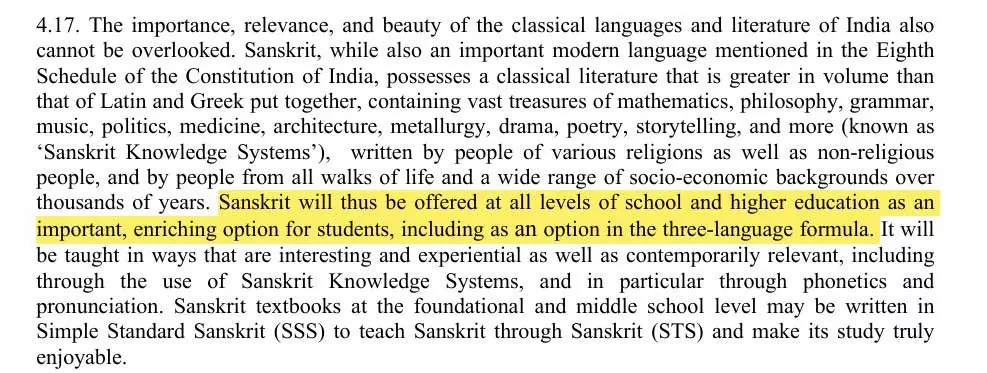ഇന്ത്യയുടെ ക്ലാസിക്കൽ ഭാഷകളുടെയും സാഹിത്യത്തിന്റെയും പ്രാധാന്യം, പ്രസക്തി, സൗന്ദര്യം തുടങ്ങിയവ അവഗണിക്കാനാവില്ലെന്ന ആമുഖത്തോടെയാണ് സംസ്കൃതത്തെക്കുറിച്ച് ദേശീയ വിദ്യാഭ്യാസ നയത്തിൽ പ്രതിപാദിക്കുന്നത്. 'വിവിധ മതങ്ങളിലുള്ളവരും മത രഹിതരും, ജീവിതത്തിന്റെ നാനാതുറകളിലുള്ളവരും വിവിധ സാമൂഹിക-സാമ്പത്തിക പശ്ചാത്തലങ്ങളിൽ നിന്നുമുള്ളവരുമായ ആളുകൾ ആയിരക്കണക്കിന് വർഷങ്ങളായി രചിച്ച സാഹിത്യമാണ് സംസ്കൃത ഭാഷയിലുള്ളത്.'