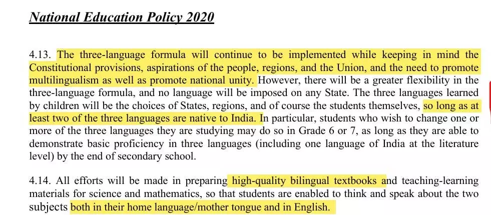 പുതിയ ദേശീയ വിദ്യാഭ്യാസ നയത്തിലൂടെ ഭാഷാ പഠനത്തിന് ത്രി ഭാഷാ പദ്ധതിയാണ് കേന്ദ്ര സർക്കാർ മുന്നോട്ടുവക്കുന്നത്. അതായത് പ്രാഥമിക ക്ലാസുകൾ തൊട്ടുതന്നെ മൂന്ന് ഭാഷകൾ പഠിക്കുക. എന്നാൽ ഈ മൂന്ന് ഭാഷകളിൽ രണ്ടെണ്ണം ഇന്ത്യൻ ഭാഷകളായിരിക്കണമെന്ന് നയം വ്യവസ്ഥ ചെയ്യുന്നു. രണ്ടെണ്ണം ഇന്ത്യൻ ഭാഷകളായാൽ മൂന്നാമത്തേത് അറബിയോ ഉറുദുവോ ആക്കാനും കഴിയില്ല. കാരണം ഇന്ത്യൻ ഭാഷകൾക്കൊപ്പം ഇംഗ്ലീഷും പഠിക്കേണ്ടതാണെന്ന് സൂചുപ്പിക്കുന്ന പരാമർശങ്ങൾ വിദ്യാഭ്യാസ നയത്തിൽതന്നെയുണ്ട് (വകുപ്പ് 4.20). മാതൃഭാഷക്ക് പുറമേ ഇംഗ്ലീഷിലാണ് പാഠ പുസ്തകങ്ങള് തയാറാക്കുക. അതിനാല് രണ്ട് ഇന്ത്യന് ഭാഷക്കൊപ്പം ഇംഗ്ലീഷും ഏറെക്കുറെ അപ്രഖ്യാപിത നിര്ബന്ധിത ഭാഷയായി പ്രയോഗത്തിലുണ്ടാകും. ത്രിഭാഷാ പദ്ധതിയിൽ മൂന്നിലൊരു ഭാഷാ ഓപ്ഷനായി സംസ്കൃതമുണ്ടാകുമെന്ന് ദേശീയ നയത്തിന്റെ 4.17 വകുപ്പിൽ പറയുന്നു. ഫലത്തിൽ രണ്ട് ഇന്ത്യൻ ഭാഷകളും ഇംഗ്ലീഷും എന്ന കോന്പിനേഷനോ അല്ലെങ്കിൽ രണ്ട് ഇന്ത്യൻ ഭാഷകളും സംസ്കൃതവുമെന്ന കോന്പിനേഷനോ അല്ലെങ്കിൽ ഒരു ഇന്ത്യൻ ഭാഷ, സംസ്കൃതം, ഇംഗ്ലീഷ് എന്ന കോന്പിനേഷനോ ആയിരിക്കാം സ്കൂളുകളിൽ പഠിപ്പിക്കപ്പെടുക. ഈ പഠന രീതി ആറാം ക്ലാസ് വരെ തുടരണം. മൂന്ന് ഭാഷകളിൽ ഒന്ന് മാറ്റാൻ ആഗ്രഹിക്കുന്ന വിദ്യാർത്ഥികൾക്ക് ആറാം ക്ലാസിലോ എഴാം ക്ലാസിലോ ആണ് അതിന് അവസരം ലഭിക്കുക. സെക്കൻഡറി സ്കൂൾ അവസാനിക്കുന്നതിന് മുമ്പ് മൂന്ന് ഭാഷകളിൽ പ്രാവീണ്യം നേടിയിരിക്കണമെന്നും ദേശീയ നയത്തിലുണ്ട്.