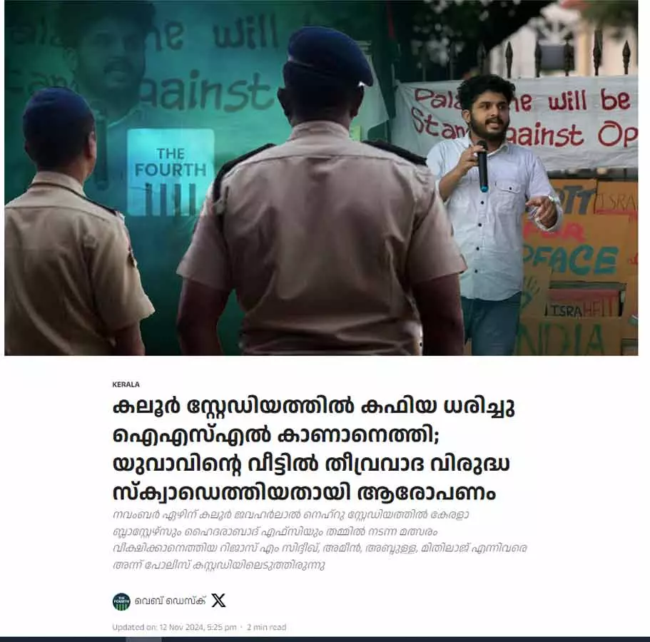2024 നവംബര് ഏഴിന് കൊച്ചിയില് കേരളാ ബ്ലാസ്റ്റേഴ്സും ഹൈദരാബാദ് എഫ്സിയും തമ്മില് നടന്ന മത്സരം വീക്ഷിക്കാന് എത്തിയ മാധ്യമപ്രവര്ത്തകന് റിജാസ് എം. സിദ്ദീഖിനെയും അദ്ദേഹത്തിന്റെ സുഹൃത്തുക്കളായ അമീന്, അബ്ദുള്ള, മിതിലാജ് എന്നിവരെയും സുരക്ഷാ ഉദ്യോഗസ്ഥര് തടഞ്ഞുവച്ചു. തുടര്ന്ന് പാലാരിവട്ടം പൊലീസ് സ്റ്റേഷനിലേക്ക് മാറ്റുകയും അഞ്ചുമണിക്കൂറോളം കസ്റ്റഡിയില് വയ്ക്കുകയും ചെയ്തു. കഫിയ ധരിച്ചതുകൊണ്ടാണോ കസ്റ്റഡിയിലെടുത്തതെന്ന് ഇവര് ചോദിച്ചെങ്കിലും പൊലീസ് നിഷേധിച്ചു. അതേസമയം, കഫിയ ധരിച്ചാല് സംശയം തോന്നുമെന്നും പറഞ്ഞു.