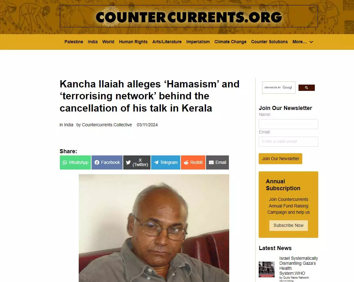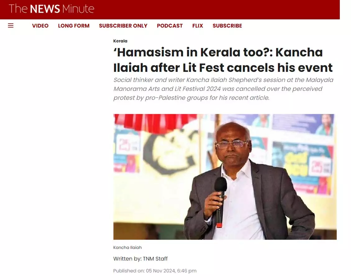മലയാള മനോരമ പത്രം മുന്കയ്യെടുത്ത് 2024 നവംബര് 1-3 തിയ്യതികളില് നടത്തുന്ന സാഹിത്യോത്സവം ‘ഹോര്ത്തൂസി’ല് പങ്കെടുക്കേണ്ടിയിരുന്ന കാഞ്ച ഇളയ ഷെപ്പേര്ഡ് അവസാന നിമിഷം തന്റെ പരിപാടി റദ്ദാക്കി. നവംബര് രണ്ടിന് കോഴിക്കോട് ആറ്റുവഞ്ചിയെന്ന പേരിലുള്ള വേദിയിലാണ് ചാലഞ്ചിങ് ഡെമോക്രാറ്റിക് നരേറ്റീവ്സ്: കാഞ്ച ഇളയാസ് റൈറ്റിങ് ആൻഡ് ആക്റ്റിവിസം എന്ന വിഷയത്തില് ഇന്ത്യയിലെ പ്രമുഖ സാമൂഹ്യശാസ്ത്രജ്ഞനായ കാഞ്ച ഇളയ സംസാരിക്കേണ്ടിയിരുന്നത്. താന് തെലുങ്ക് പത്രമായ സാക്ഷിയില് എഴുതിയ ഇസ്രായേല് അനുകൂല ലേഖനത്തിന്റെ പേരില് പ്രതിഷേധ ഭീഷണിയുണ്ടെന്നും ഇക്കാര്യത്തില് സംരക്ഷണം നല്കാന് കേരള സര്ക്കാരോ പരിപാടിയുടെ സംഘാടകരോ തയ്യാറാകാത്തതിനാലാണ് പരിപാടിയുമായി മുന്നോട്ടുപോകേണ്ടെന്ന് തീരുമാനിച്ചതെന്നും അദ്ദേഹം പറയുന്നു.