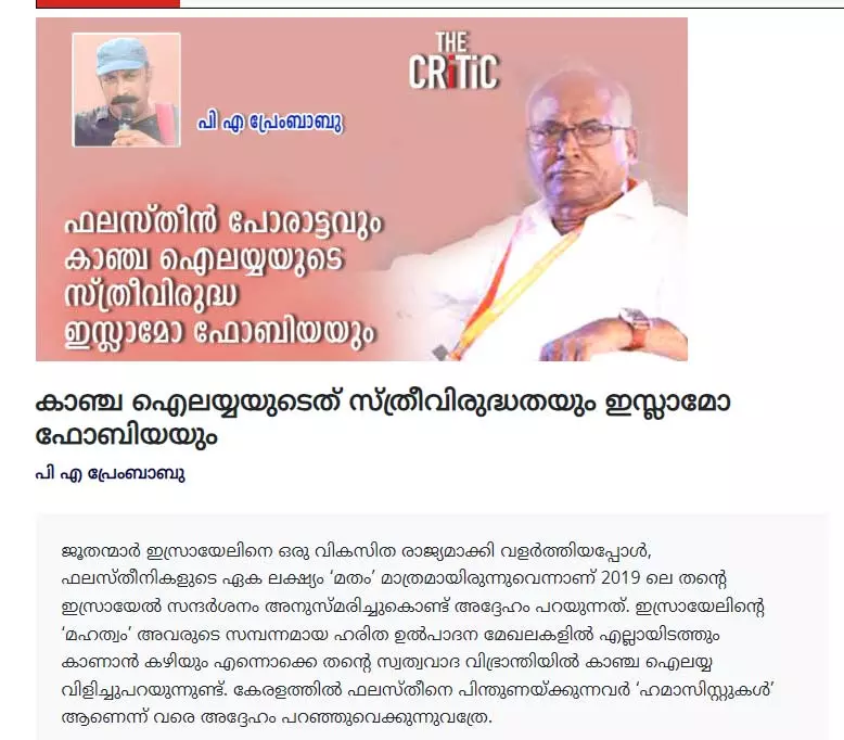 ഇസ്ലാമോഫോബിയയുടെ ഏറ്റവും ക്രൂരമായ ഇരകള് സ്ത്രീകളും കുട്ടികളുമാണെന്നും അതുകൊണ്ടുതന്നെ അവരെ പിഴുതെടുത്ത് തലങ്ങും വിലങ്ങും എറിഞ്ഞാല് ആ വംശത്തെ തന്നെ ലോകത്തിനു മുമ്പില് ഒറ്റപ്പെടുത്താനും നാശോന്മുഖമാക്കുവാനും സാധിക്കുമെന്നും സാമ്രാജ്യത്വത്തിനും ഫാസിസത്തിനും സയണിസത്തിനും വേണ്ടി സ്വയം സമുദ്ധരിക്കുന്ന, അതിന് ആനുപാതികമായ ന്യായശാസ്ത്രം അവതരിപ്പിക്കുന്ന കാഞ്ച ഐലയ്യമാര്ക്ക് അറിയാമെന്നു പറഞ്ഞാണ് തന്റെ വാദങ്ങള് ഉപസംഹരിക്കുന്നത്. ('കാഞ്ച ഐലയ്യുടേത് സ്ത്രീവിരുദ്ധതയും ഇസ്ലാമോ ഫോബിയയും' , പി.എ പ്രേംബാബു, ദി ക്രിട്ടിക്ക്, ഡിസംബര് 4, 2024)