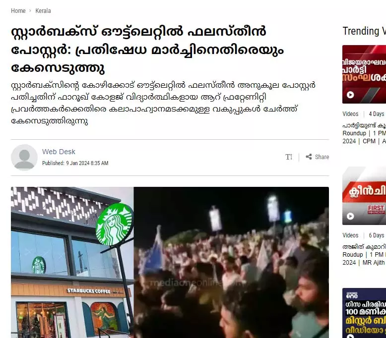 ഇസ്രായേല് അനുകൂല നിലപാടിന്റെ പേരില് ലോകം മുഴുവന് ബഹിഷ്കരണം നേരിടുന്ന ബ്രാന്ഡുകളിലൊന്നാണ് സ്റ്റാര്ബക്സ്. ഇവരുടെ ഒരു ഔട്ട്ലെറ്റ് കോഴിക്കോടും തുടങ്ങിയിട്ടുണ്ട്. ഫലസ്തീന് പ്രശ്നം കത്തിനില്ക്കുന്ന സമയത്ത് സ്റ്റാര്ബക്സിനെതിരേ ഫാറൂഖ് കോളജിലെ ഫ്രറ്റേണിറ്റി പ്രവര്ത്തകര് ഒരു പോസ്റ്റര് പതിച്ചു. തികച്ചും സമാധാപരമായ ഈ സമരത്തിനെതിരെ പൊലീസ് കേസെടുത്തു. ആറു പേരെയാണ് ഈ കേസില് പ്രതിചേര്ത്തത്. ഇതില് പ്രതിഷേധിച്ച് വിദ്യാര്ത്ഥികള് സ്റ്റാര്ബക്സിലേക്ക് മാര്ച്ച് നടത്തി. ഈ മാര്ച്ചിനെതിരേയും പൊലീസ് കേസെടുത്തു. കലാപാഹ്വാനമടക്കമുള്ള വകുപ്പുകള് ചേര്ത്തായിരുന്നു നാല്പ്പതോളം പേര്ക്കെതിരേ കേസെടുത്തത്. (സ്റ്റാര്ബക്സ് ഔട്ട്ലെറ്റില് ഫലസ്തീന് പോസ്റ്റര്: പ്രതിഷേധ മാര്ച്ചിനെതിരെയും കേസെടുത്തു, മീഡിയാവണ്, ജനുവരി 9, 2024)