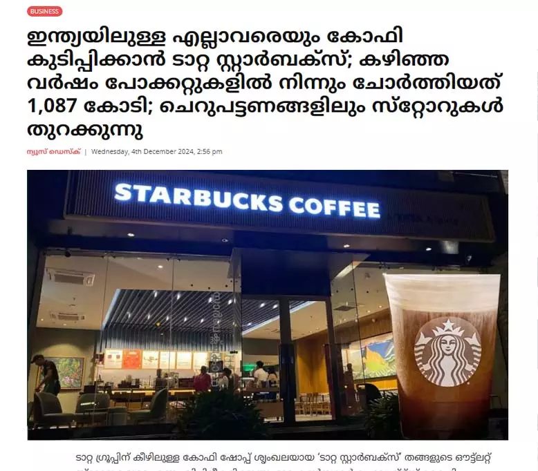 ഒരു കാര്യം യുട്യൂബര് പറഞ്ഞത് ശരിയാണ്: സ്റ്റാര്ബക്സും ടാറ്റ ഗ്രൂപ്പും ചേര്ന്ന് 2012ലാണ് ടാറ്റ സ്റ്റാര്ബക്സ് ഇന്ത്യയില് ആരംഭിച്ചത്. ടാറ്റ സ്റ്റാര്ബക്സിന് ഇപ്പോള് 70 നഗരങ്ങളിലായി 457 കഫേകള് ഉണ്ട്. (ഇന്ത്യയിലുള്ള എല്ലാവരെയും കോഫി കുടിപ്പിക്കാന് ടാറ്റ സ്റ്റാര്ബക്സ്; കഴിഞ്ഞ വര്ഷം പോക്കറ്റുകളില് നിന്നും ചോര്ത്തിയത് 1087 കോടി; ചെറുപട്ടണങ്ങളിലും സ്റ്റോറുകള് തുറക്കുന്നു, സൗത്ത് ലൈവ്, ഡിസംബര് 4, 2024).
