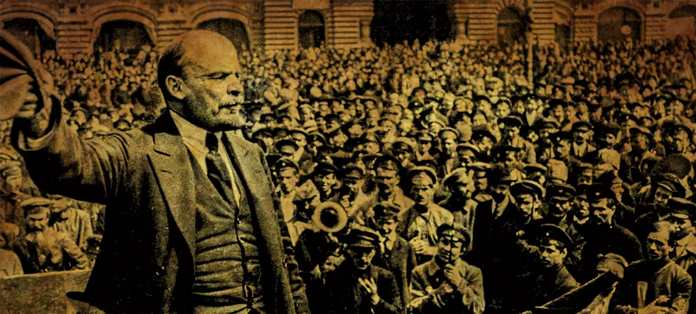 അതാ, ലെനിന് എണീറ്റു. പ്രസംഗപീഠത്തിന്റെ വക്കത്ത് പിടിച്ചുകൊണ്ട് നില്ക്കുമ്പോള് അദ്ദേഹത്തിന്റെ ഇറുകിപ്പിടിച്ച കൊച്ചുകണ്ണുകള് സദസ്സിലുടനീളം സഞ്ചരിച്ചു. അനേകം മിനിട്ടുകള് നീണ്ടുനിന്ന, അലയലയായി മുഴങ്ങിക്കൊണ്ടിരിക്കുന്ന ഹര്ഷാരവം അദ്ദേഹം കേട്ടതായി തോന്നിയില്ല.