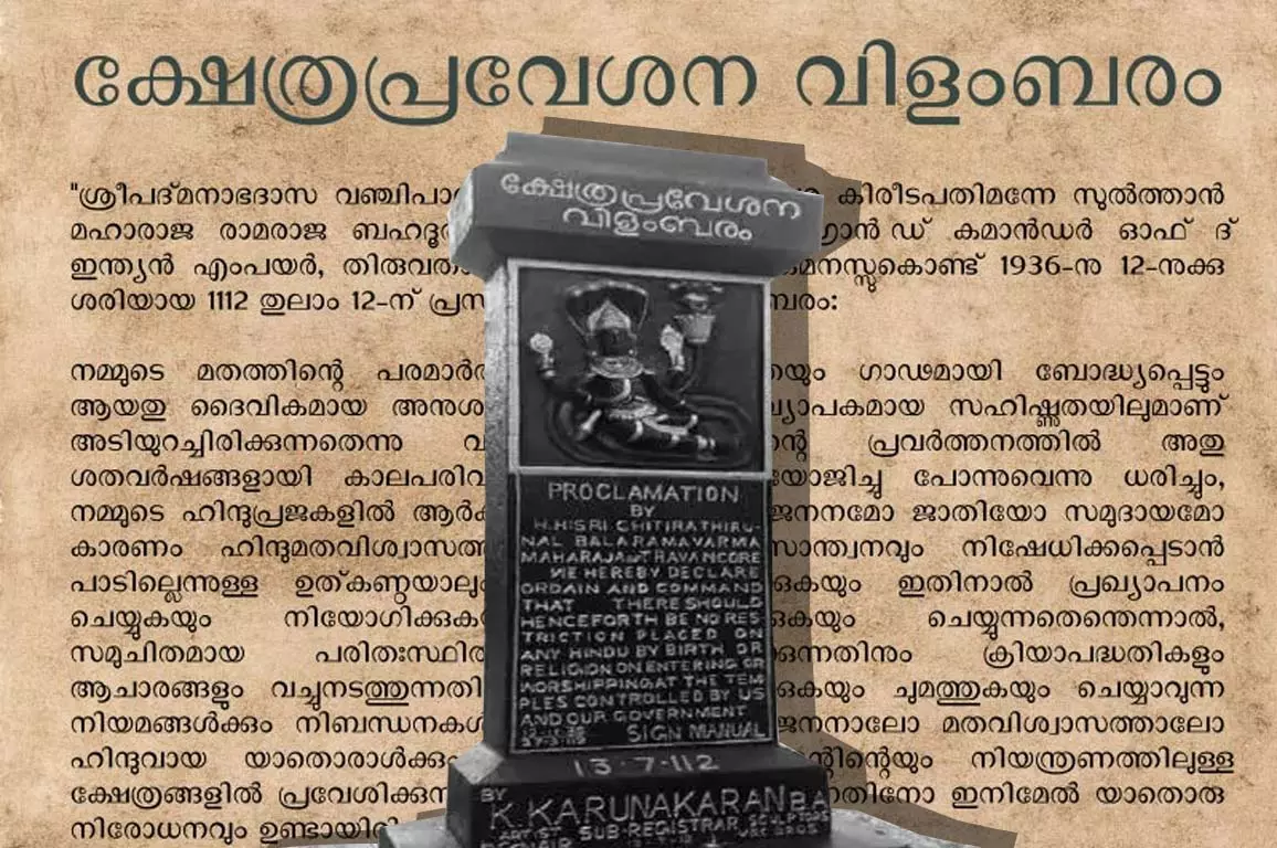 1936ലെ ക്ഷേത്രപ്രവേശന വിളംബരത്തില് ഇങ്ങനെ വായിക്കാം: ''.....നമ്മുടെ ഹിന്ദുപ്രജകളില് ഒരാള് പോലും ആയാളുടെ ജനനമോ ജാതിയോ സമുദായമോ നിമിത്തം ഹിന്ദുമതത്തില്നിന്ന് ലഭിക്കുന്ന ആശ്വാസവും സമാധാനവും നിഷേധിക്കപ്പെട്ടുപോകരുത് എന്നു ഉല്ക്കണ്ഠയുള്ളതുകൊണ്ടും, ഇനിമേലില് നമ്മാലും നമ്മുടെ ഗവണ്മെണ്ടിനാലും നിയന്ത്രിക്കപ്പെടുന്ന ക്ഷേത്രങ്ങളില് അവയുടെ ശരിയായ അന്തരീക്ഷത്തെ നിലനിര്ത്താനും കര്മ്മങ്ങളെയും അനുഷ്ടാനങ്ങളേയും പാലിക്കാനും, ആയി നമ്മാല് നിശ്ചയിക്കപ്പെടുകയോ ചുമത്തപ്പെടുകയോ ചെയ്തേക്കാവുന്ന നിശ്ചയങ്ങള്ക്കും നിബന്ധനകള്ക്കും വിധേയമായനിലയില് പ്രവേശിക്കയും ആരാധന നടത്തുകയും ചെയ്യുന്നതില് യാതൊരു ഹിന്ദുവിന്റെയും പേരില് ജനനമോ മതമോ കൊണ്ടുള്ള യാതൊരു തടസ്ഥവും ഉണ്ടായിരിക്കുവാന് പാടില്ല എന്ന് നാം നിശ്ചയിക്കുകയും ഇതിനാല് അത് വിളംബരപ്പെടുത്തുകയും അധികാരപ്പെടുത്തുകയും ശാസിക്കുകയും ചെയ്തിരിക്കുന്നു'' - അതായത് ക്ഷേത്രപ്രവേശന വിളംബരം കേവലമായ പ്രവേശനസ്വാതന്ത്ര്യവും ആരാധനാസ്വാതന്ത്ര്യവും മാത്രമാണ് അവര്ണര്ക്ക് അനുവദിച്ചത്.