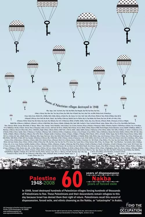 ''അല്-നക്ബ. അറുപതു കൊല്ലമായി ബലം പ്രയോഗിച്ച് നാടുകടത്തപ്പെട്ട ഫലസ്തീനികളുടെ ഇനിയും മരിച്ചിട്ടില്ലാത്ത ഇച്ഛാശക്തിയുടെ പ്രകടനപത്രികയാണിത്...' ഞാന് കൗതുകത്തോടെ ആ പോസ്റ്റര് നോക്കിയിരുന്നു. എനിക്കൊന്നും മനസ്സിലായില്ല. നൂറുകണക്കിന് പാരചൂട്ടുകള് പറന്നിറങ്ങുന്ന ഒരു ചിത്രം. ഓരോ പാരചൂട്ടിനും അറബിയുടെ സ്വത്വബോധത്തെ പ്രസരിപ്പിക്കുന്ന എന്തോ ഒന്നുണ്ട്. ആദ്യം അതെന്താണെന്ന് മനസ്സിലായില്ല. പെട്ടെന്നാണ് ബോധോദയം ഉണ്ടായത്. ഈ പാര്ക്യൂട്ടുകളെല്ലാം അറബി കളുടെ ശിരോവസ്ത്രമായ ''കുഫിയ്യ'കള് ആണ്. കറുപ്പും വെളുപ്പും ചതുര ങ്ങള് നിറഞ്ഞ ഫലസ്തീനിയന് 'കുഫിയ്യ'കള്. ''കുഫിയ്യകള്' പാരച്യൂട്ടുകളായി വിടര്ത്തി അതിന്റെ അറ്റത്ത് മനുഷ്യര്ക്ക് പകരം താക്കോലുകള്. നൂറുകണക്കിന് താക്കോലുകള് ജെറൂസലമിലേക്ക് മാനത്തില് നിന്നിറങ്ങിവരുന്നു. താഴെ ഗ്രാമങ്ങളുടെയും നഗരങ്ങളുടെയും നഷ്ടാവശിഷ്ടങ്ങള്ക്കുമേല് എന്തൊക്കെയോ എഴുതിവെച്ചിരിക്കുന്നു.