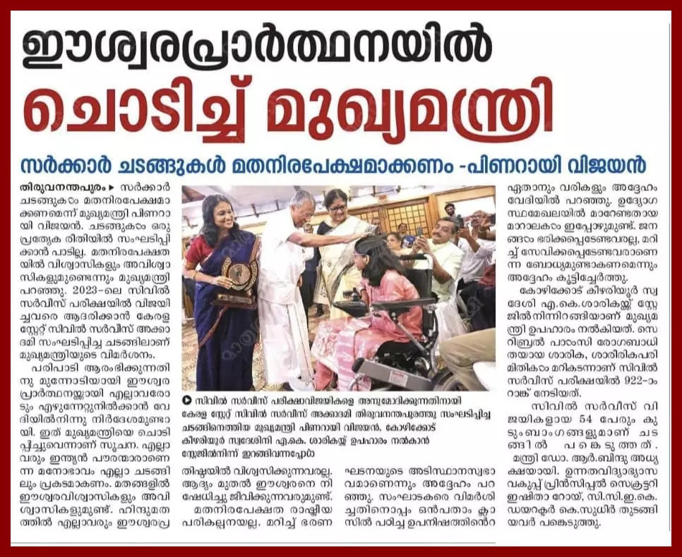 സിവില് സര്വീസ് നേടിയവരെ അനുമോദിക്കാന് തിരുവനന്തപുരം സിവില് സര്വീസ് അക്കാദമി ജൂലൈ 3 2024നു സംഘടിപ്പിച്ച പരിപാടിയില് മുഖ്യമന്തി പിണറായി വിജയന് ഈശ്വര പ്രാര്ഥനയുമായി ബന്ധപ്പെട്ട് നടത്തിയ ചില പ്രസ്താവനകള് വലിയ തോതില് ചര്ച്ച ചെയ്യപ്പെട്ടു. പരിപാടി ആരംഭിക്കുന്നതിനു മുന്നോടിയായി ഈശ്വരപ്രാര്ഥനയ്ക്കായി എല്ലാവരോടും എഴുന്നേറ്റുനില്ക്കാന് വേദിയില്നിന്നു നിര്ദേശമുണ്ടായി. ഇത് മുഖ്യമന്ത്രിയെ ചൊടിപ്പിച്ചു. സര്ക്കാര് ചടങ്ങുകള് മതനിരപേക്ഷമാക്കണമെന്ന് അദ്ദേഹം ഓര്മിപ്പിച്ചു. വിശ്വാസികളും അവിശ്വാസികളുമുണ്ട്, മതനിരപേക്ഷത രാഷ്ട്രീയ പരികല്പനയല്ല, ഭരണഘടനയുടെ അടിസ്ഥാനസ്വഭാവമാണ്. ഒന്പതാം ക്ലാസില് പഠിച്ച ഉപനിഷത്തിന്റെ ഏതാനും വരികളും അദ്ദേഹം വേദിയില് ചൊല്ലി (മാതൃഭുമി ഓണ്ലൈന്, ജൂലൈ 3, 2024).