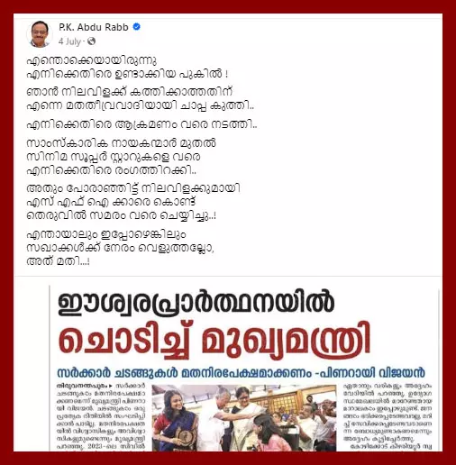 ഈ വാര്ത്തയോട് മുന് വിദ്യാഭ്യാസ മന്ത്രിയും മുസ്ലിം ലീഗ് നേതാവുമായ പി.കെ അബ്ദുറബ്ബ് ഫേസ്ബുക്കിലൂടെ പ്രതികരിച്ചു. (എഫ്ബി, ജൂലൈ 4, 2024) നിലവിളക്ക് കത്തിക്കാത്തതിന് തന്നെ മതതീവ്രവാദിയായി ചാപ്പ കുത്തിയ അനുഭവം അദ്ദേഹം ഓര്മിപ്പിച്ചു. സാംസ്കാരിക നായകര് മുതല് സിനിമ സൂപ്പര് സ്റ്റാറുകള് വരെ തനിക്കെതിരേ രംഗത്തിറങ്ങി. പോരാഞ്ഞിട്ട് നിലവിളക്കുമായി എസ്.എഫ്.ഐക്കാരെകൊണ്ട് തെരുവിലും സമരം ചെയ്യിച്ചു! എന്തായാലും ഇപ്പോഴെങ്കിലും സഖാക്കള്ക്ക് നേരം വെളുത്തല്ലോയെന്നായിരുന്നു പരിഹാസം.