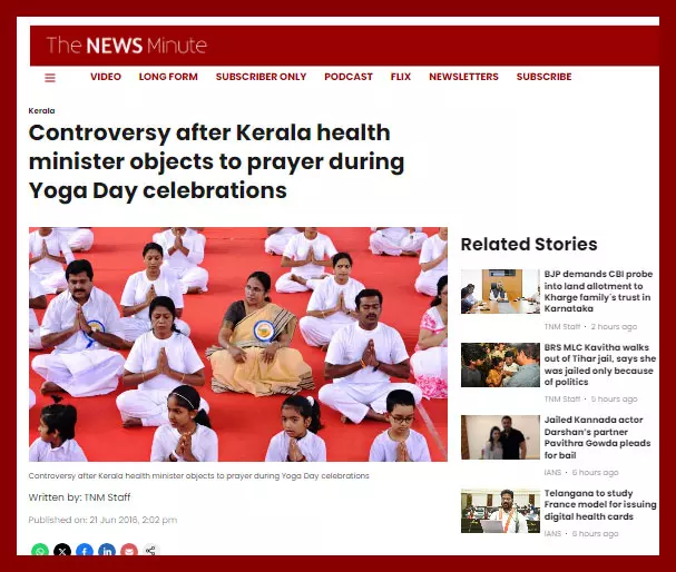 2016 ജൂണ് 21ന് ദി ന്യൂസ് മിനിറ്റ്സ് റിപ്പോര്ട്ട് ചെയ്തതനുസരിച്ച് യോഗാദിനത്തില് യോഗ ചെയ്യുന്നതിനു മുന്നോടിയായി പ്രാര്ഥന ആലപിച്ചതിനെ അന്നത്തെ ആരോഗ്യമന്ത്രിയായിരുന്ന കെ.കെ ഷൈലജ ടീച്ചര് ചോദ്യം ചെയ്തു. യോഗ ചെയ്യുന്ന കാര്പ്പറ്റില് മറ്റുളളവര് കൈകൂപ്പി ഇരിക്കുമ്പോള് കൈകൂപ്പാതെ ഇരുന്ന് അവര് പ്രതിഷേധം പ്രകടിപ്പിക്കുകയും ചെയ്തു. പ്രാര്ഥന മതപരമാണെന്നും യോഗ മതേതരമാണെന്നുമായിരുന്നു മന്ത്രി വാദിച്ചത്. ഷൈലജ ടീച്ചറുടെ പ്രവൃത്തി വ്യാപകമായി അംഗീകരിക്കപ്പെട്ടു. ഒപ്പം അവര്ക്കെതിരേ വിമര്ശനവും ഉയര്ന്നു. എന്നാല്, നിലവിളക്ക് കത്തിക്കുന്നതില്നിന്ന് ഒഴിഞ്ഞുമാറിയ മുസ്ലിംലീഗ് നേതാക്കള് കേള്ക്കേണ്ടിവന്നതുപോലുള്ള വിമര്ശനം അവര്ക്ക് നേരിടേണ്ടിവന്നില്ല.