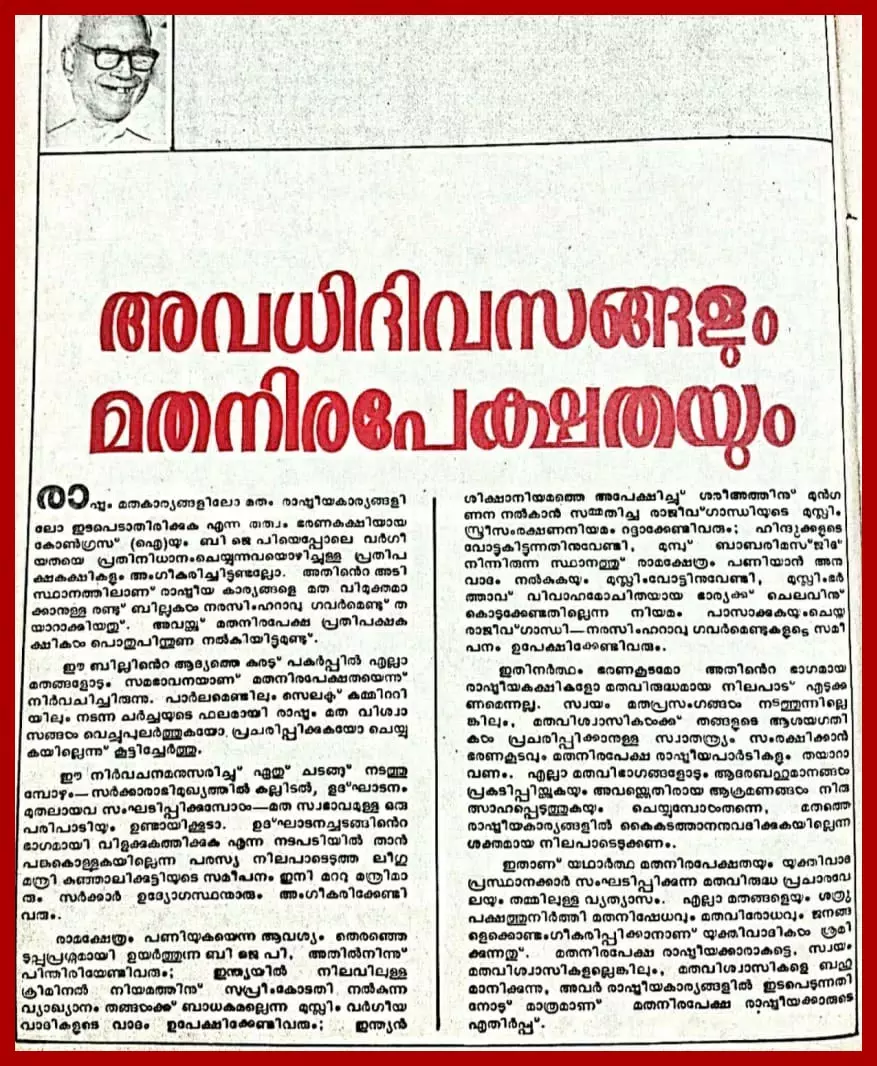 അതേ വര്ഷം ഒക്ടോബറില് ഇ.എം.എസ് ഈ വിഷയത്തില് ഒരു വിശദീകരണം നല്കി: ''സര്ക്കാര് ആഭിമുഖ്യത്തില് കല്ലിടല്, ഉദ്ഘാടനം മുതലായവ സംഘടിപ്പിക്കുമ്പോള് മതസ്വഭാവമുള്ള ഒരു പരിപാടിയും ഉണ്ടായിക്കൂട. ഉദ്ഘാടന ചടങ്ങിന്റെ ഭാഗമായി വിളക്ക് കത്തിക്കുക എന്ന നടപടിയില് താന് പങ്കുകൊള്ളുകയില്ലെന്ന പരസ്യ നിലപാടെടുത്ത ലീഗുമന്ത്രി കുഞ്ഞാലിക്കുട്ടിയുടെ സമീപനം ഇനി മറ്റു മന്ത്രിമാരും സര്ക്കാര് ഉദ്യോഗസ്ഥരും അംഗീകരിക്കേണ്ടിവരും' (അവധി ദിവസങ്ങളും മതനിരപേക്ഷതയും, 1993 ഒക്ടോബര് 10, പുസ്തകം 25, ലക്കം 17, പേജ് 6) പൊതുഅവധി ദിവസങ്ങളെക്കുറിച്ചുള്ള ദേശാഭിമാനി കോളത്തിലാണ് അദ്ദേഹം ഇതുസംബന്ധിച്ച പരാമര്ശം നടത്തിയത്.