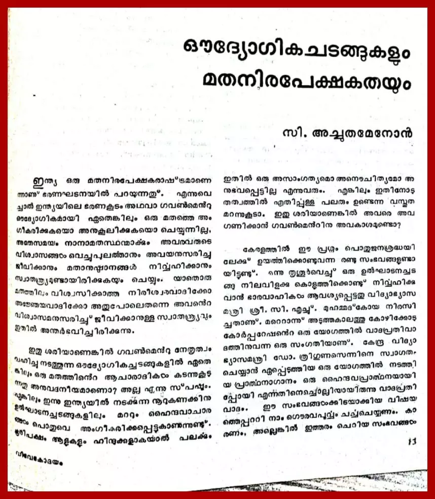കമ്യൂണിസ്റ്റ് പാര്ട്ടി നേതാവായ സി. അച്യുതമേനോന് ഇതേ കുറിച്ച് വിവേകോദയത്തില് ലേഖനമെഴുതി. ഈ നിര്ബന്ധബുദ്ധിയെ അനുചിതമെന്നാണ് അദ്ദേഹം വിശേഷിപ്പിച്ചത്. മതനിരപേക്ഷ രാഷ്ട്രമായ ഇന്ത്യയില് സര്ക്കാര് ചടങ്ങുകളില് നിലവിളക്ക് പോലുള്ള ആചരണരീതികള് ഒഴിവാക്കണം. ഇത്തരം പരിപാടികളില് നിലവിളക്ക് കത്തിക്കുന്നതില് അനൗചിത്യം തോന്നാത്തത് നാട്ടില് ഭൂരിഭാഗവും ഹിന്ദുക്കളായതുകൊണ്ടാണ്. നിലവിളക്ക് കത്തിക്കേണ്ടതില്ലെന്ന് തീരുമാനിക്കാന് ആര്ക്കും അവകാശമുണ്ട്. സര്ക്കാര് ചടങ്ങുകളില് നിന്ന് നിലവിളക്ക് പോലുള്ളവ മാറ്റിനിര്ത്തണമെന്ന് ഉത്തരവിറക്കണമെന്നും അദ്ദേഹം നിഷ്കര്ഷിച്ചു. എന്നാല്, സര്ക്കാരേതര പരിപാടികളില് നിന്ന് മതച്ഛായ ഒഴിവാക്കുന്നതിനെ അദ്ദേഹം അനുകൂലിച്ചിരുന്നില്ല. അത്തരം സന്ദര്ഭങ്ങളില് വിഭിന്ന മതസ്ഥര് തമ്മില് യാതൊരസ്വാരസ്യത്തിനും വഴിവെക്കാതെ അങ്ങേയറ്റത്തെ സഹിഷ്ണുത വളര്ത്താനായിരിക്കണം ശ്രമമെന്നായിരുന്നു അദ്ദേഹം എഴുതിയത്. ഉദ്ഘാടനച്ചടങ്ങിലെ പൊതുപ്രാര്ഥന, പെണ്കുട്ടികളെ അണിനിരത്തിയ താലപ്പൊലി തുടങ്ങിയവയെക്കുറിച്ചും അദ്ദേഹം എഴുതിയിരുന്നു. (ഔദ്യോഗിക ചടങ്ങുകളും മതനിരപേക്ഷതയും, 1968 നവംബര്, വിവേകോദയം, പുസ്തകം 2, ലക്കം 11, പേജ് 13).