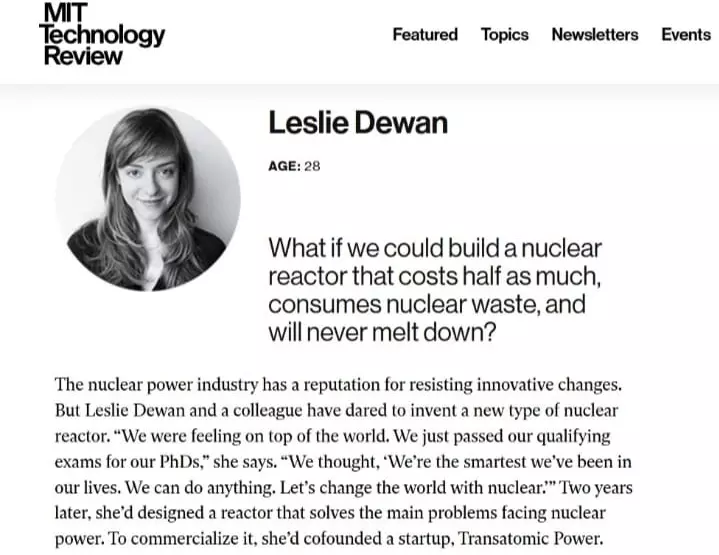 ലെസ്ലി ദിവാന് മസാച്ചുസെറ്റ്സ് ഇന്സ്റ്റിറ്റ്യൂട്ട് ഓഫ് ടെക്നോളജിയില് നിന്നും ന്യൂക്ലിയര് എഞ്ചിനീയറിംഗില് ഡോക്ടറല് ബിരുദം നേടിയ യുവതിയാണ്. തന്റെ പഠനത്തിന് ശേഷം, 28ാമത്തെ വയസ്സില്, Transatomic Power എന്നൊരു കമ്പനി സ്ഥാപിച്ച് അതിന്റെ ചീഫ് എക്സിക്യൂട്ടീവ് ഓഫീസറായി ചാര്ജ്ജെടുത്ത ലെസ്ലി ലോകത്തിന്റെ മുന്നില് ഒരു ചോദ്യം ഉയര്ത്തി. ''What If We Could Build a Nuclear Reactor That Costs Half as Much, Consume Nuclear Waste, and Will Never Melt Down?'