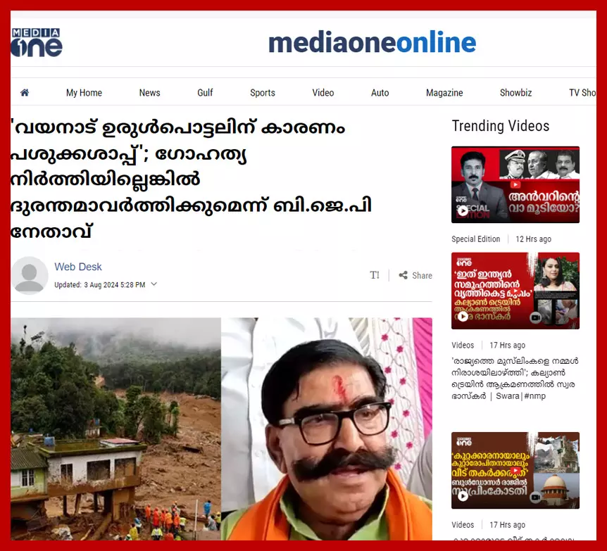 വയനാട് മുണ്ടക്കൈ, ചൂരല്മല തുടങ്ങിയ സ്ഥലങ്ങളില് ഉണ്ടായ ഉരുള്പൊട്ടല് ദുരന്തത്തിന് പിറകെ ചില ഉത്തരേന്ത്യന് ഹിന്ദുത്വ സാമൂഹ്യമാധ്യമങ്ങള് നടത്തിയ വംശീയ പ്രചരണങ്ങള് ഇങ്ങനെ: വയനാട്ടിലെ ദുരന്തം രാഹുല് ഗാന്ധിയെ ജയിപ്പിച്ചവര്ക്കുള്ള മറുപടിയാണ്. ബീഫ് ഭക്ഷിച്ചതിനുള്ള ശിക്ഷ, ഹിന്ദിയെ അം ഗീകരിക്കാതിരിക്കല്, ക്രിസ്തുമതത്തെ പിന്തുടരല്, ബിജെപിയെ വിജയിപ്പിക്കാതിരിക്കല്, ഫലസ്തീനോട് ഐക്യദാര്ഢ്യം പ്രകടിപ്പിച്ചത് തുടങ്ങിയവയാണ് മറ്റു വിമര്ശനങ്ങള്. ഹിന്ദുത്വ ഫാസിസ്റ്റ് പ്രചാരണ മാധ്യമമായ തത്വ ഇന്ത്യയുടെ കമന്റ് സെക്ഷനിലാണ് കേരളത്തെയും മുസ്ലിംകളെയും അവഹേളിക്കും വിധത്തിലുള്ള കമന്റുകള് നിറഞ്ഞത്. ദൈവത്തിന്റെ സ്വന്തം നാടിനോട് ദൈവത്തിന് പോലും താല്പര്യമില്ലെന്നാണ് ചിലരുടെ ആക്ഷേപം. വയനാട്ടില് നടന്ന ദുരന്തം മലപ്പുറത്തായിരുന്നു സംഭവിക്കേണ്ടിയിരുന്നതെന്നും അവിടെ കത്വ ജനസംഖ്യ കൂടുതലാണെന്നും തുടങ്ങി വിദ്വേഷം നിറഞ്ഞ നിരവധി കമന്റുകളാണ് സമൂഹമാധ്യമങ്ങളില് ഹിന്ദുത്വവാദികള് പങ്കുവെക്കുന്നത്. (മാധ്യമം ദിനപത്രം, ജൂലൈ 31, 2024)