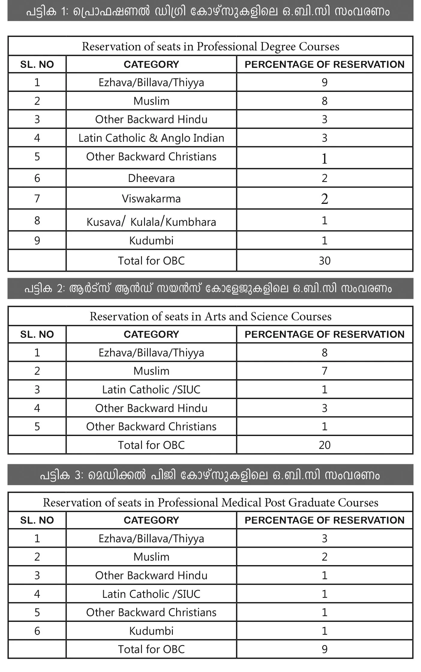 എല്ലാ കോഴ്സുകളിലും ഉദ്യോഗ സംവരണ തോതിന്റെ മാതൃകയില് 40% ആക്കി ഏകീകരിക്കാനായി കേരള ഹൈക്കോടതിയില് നല്കിയ പൊതു താല്പര്യ ഹരജിയിന്മേലുള്ള വിധിയില് (കേസ് നമ്പര് WPC 1171/2021) ഉചിതമായ നടപടികള് കൈക്കൊള്ളാന് കേരള ഹൈക്കോടതി 2021 ഫെബ്രുവരി 02 നു ചീഫ്സെക്രട്ടറിയോട് നിര്ദ്ദേശിച്ചിട്ടുണ്ട്. എന്നാല്, 2021 ലെ നിയമസഭാ തെരഞ്ഞെടുപ്പ് പെരുമാറ്റ ചട്ടം നിലവില് വന്നതിനാല് കോടതിയോട് സമയം നീട്ടി ചോദിച്ച സര്ക്കാര് കഴിഞ്ഞ രണ്ടു വര്ഷത്തോളമായി യാതൊരു നടപടികളും എടുക്കാതെ പിന്നോക്ക സമുദായങ്ങളെ വഞ്ചിച്ചു കൊണ്ടിരിക്കുകയാണ്. മുന്നോക്ക സമുദായങ്ങളുടെ അവസ്ഥ പഠിക്കാന് ആറു മാസം മാത്രം എടുത്ത സര്ക്കാരിന്റെ പിന്നോക്ക സമുദായങ്ങളോടുള്ള ''കരുതലും കൈതാങ്ങും'' അസൂയാര്ഹം തന്നെ!.