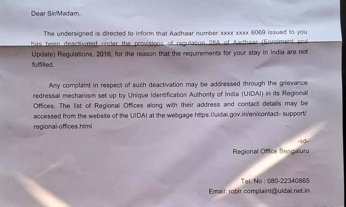 '................... has been deactivated under the provisions of Regulation 28A of Aadhar (Enrolment and update) Regulations 2016 for the reason that the requirements for your stay in India are not fulfilled'