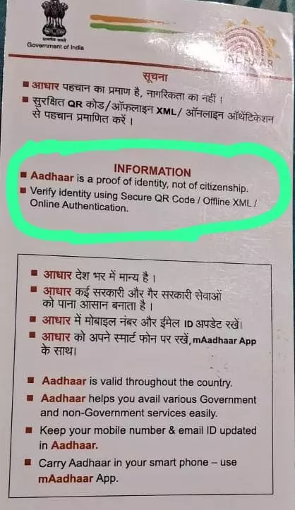 വെറും ക്ലറിക്കല് മിസ്റ്റേക്ക് എന്ന പേരില് ഒരാഴ്ച എന്റെ മകളെ ഇന്ത്യക്കാരിയല്ലാതാക്കിയത് ബി.ജെ.പി സര്ക്കാരാണ്. 'Aadhar is a proof of identify, not of citizenship.' ആധാര് പൗരത്വം തെളിയിക്കുന്നതിനുള്ള രേഖയല്ല എന്ന് കാര്ഡിന്റെ പുറകില് തന്നെ എഴുതിയിട്ടുണ്ട്. പക്ഷേ, പൗരത്വം തെളിയിക്കാന് മാത്രമല്ല, അപേക്ഷിക്കുന്ന സകല രേഖകള്ക്കും ആധാര് കാര്ഡ് നിര്ബന്ധമാണ് എന്നതാണ് വിരോധാഭാസം.