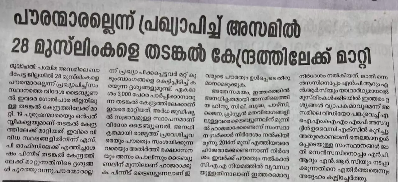 പൗരന്മാരല്ലെന്ന് പ്രഖ്യാപിച്ച് അസമിലെ ബാര്പേട്ട ജില്ലയിലെ 28 മുസ്ലിംകളെ തടങ്കല്പാളയത്തിലേക്ക് അയച്ച വാര്ത്ത കഴിഞ്ഞദിവസമാണ് പത്രങ്ങളില് വായിച്ചത്. എന്പിആറും എന്ആര്സിയുമൊക്കെ തലക്കുമുകളില് വാള്കണക്കെ തൂങ്ങിയാടുമ്പോള് ഭരണകൂടത്തോടുള്ള മറു ചോദ്യങ്ങള് അനിവാര്യമാകുന്നു.