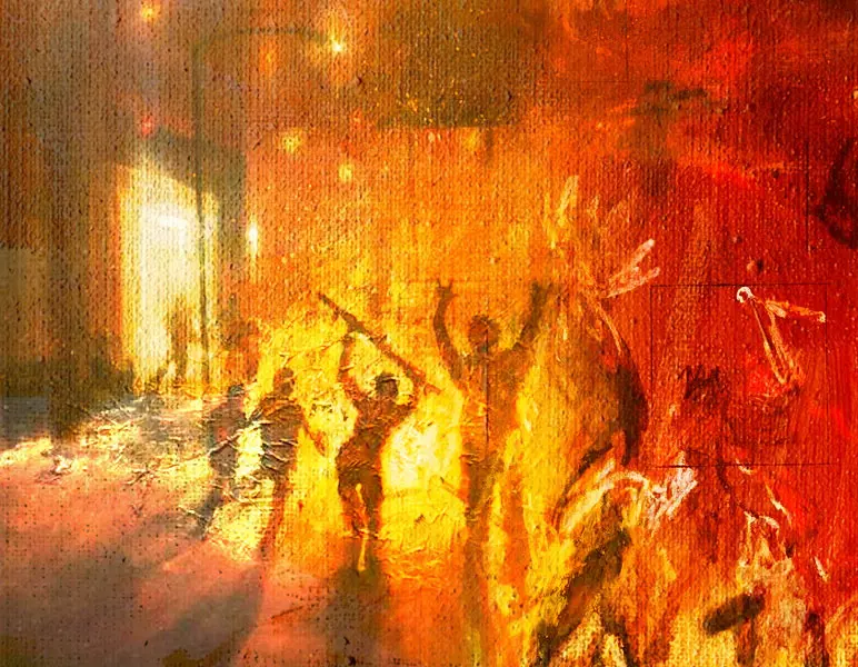 എന്റെ കാലുകള് വിറച്ചു. ബലം ക്ഷയിക്കുന്നത് പോലെത്തോന്നി. പണ്ടായിരുന്നെങ്കില് ഞാനിവരെ അടിച്ചു വീഴ്ത്തുമായിരുന്നു. ഇന്നെനിക്ക് അതിനു സാധിക്കുകയില്ല. തൊട്ടടുത്ത് ഒരു തീപ്പന്തം ആളിക്കത്തി. പടര്ന്നു പിടിക്കുന്ന ചുവപ്പു ഭൂതത്തിന്റെ അവ്യക്തമായ അരികുകളുടെ ഭാഗമാകാന് ഞാന് ഭയന്നു.