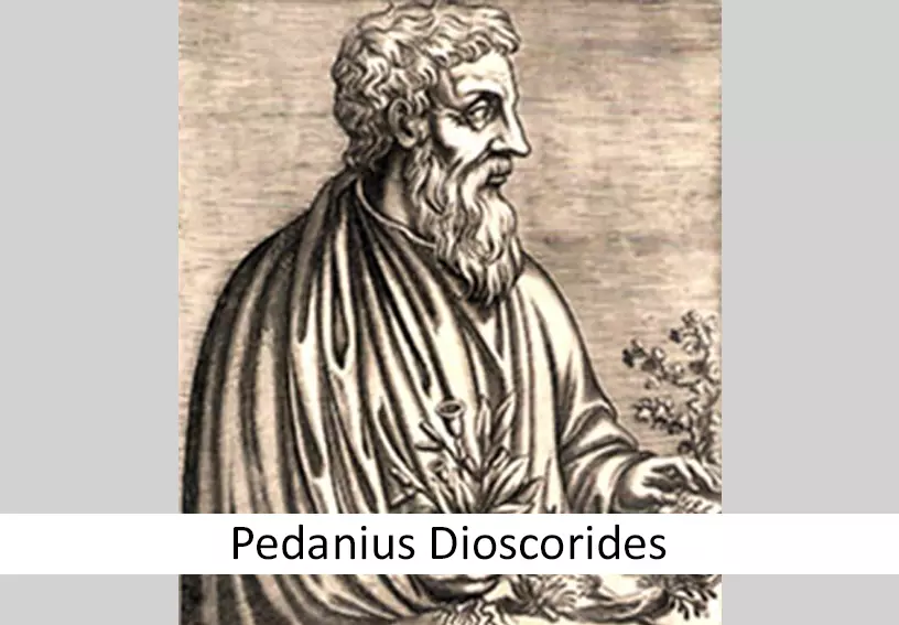 റോമന് പട്ടാളത്തില് ജോലി ചെയ്തിരുന്ന പെഡാനിയസ് ഡിസ്കോറൈഡെസ് (Pedanius Dioscorides) എന്ന ഗ്രീക്ക് ഡോക്ടര് ആണ് എ.ഡി 40നും 70 നും ഇടയ്ക്ക് 110 പേജുകളുള്ള 'മെറ്റീരിയ മെഡിക്ക' എന്ന ഫാര്മക്കോളജിയുടെ ബൈബിള് എന്നു വിശേഷിപ്പിക്കപ്പെട്ട ഗ്രന്ഥമെഴുതിയത്. ഇദ്ദേഹം നീറോ ചക്രവര്ത്തിയുടെ പട്ടാളത്തിലെ ഡോക്ടര് ആയിരുന്നു. പാപ്പിറസ് ചെടിയുടെ താളുകളിലാണ് ഇത് ആദ്യം എഴുതപ്പെട്ടത്.