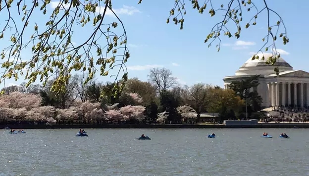 പിറ്റേന്ന് ഹോട്ടലില് നിന്നും പ്രാതല് കഴിഞ്ഞു 11 മണിയോടെയാണ് പുറപ്പെട്ടത്. 10 ഡിഗ്രി സെന്റി ഗ്രെയ്ഡാണ് ചൂട്. പക്ഷേ, നല്ല സൂര്യപ്രകാശം ഉള്ളതുകൊണ്ട് നടക്കാന് നല്ല സുഖം തോന്നി. കൂട്ടിന് നല്ല തെളിഞ്ഞ നീലാകാശവും! ഇവിടത്തെ പ്രധാന ദേശീയ സ്മാരകങ്ങളായ ജഫേഴ്സണ് മെമ്മോറിയല് മാര്ട്ടിന് ലൂഥര് കിംഗ് മെമ്മോറിയല്, ഫ്രാങ്ക്ലിന് റൂസ്വെല്റ്റ് മെമ്മോറിയല് എന്നിവ സ്ഥിതി ചെയ്യുന്നതിന് അടുത്തുള്ള ഭാഗികമായി മനുഷ്യ നിര്മിതമായ ഒരു തടാകമാണ് ടൈഡല് ബെയിസിന്. വാഷിംഗ്ടണ് ചാനലിനും പോട്ടൊമാക് റിവറിനും ഇടയിലാണ് ഇതിന്റെ സ്ഥാനം. ഈ തടാകത്തിന്റെ കരയിലാണ് ചെറിമരങ്ങള് പ്രധാനമായും നട്ട് പിടിപ്പിച്ചിരിക്കുന്നത്.