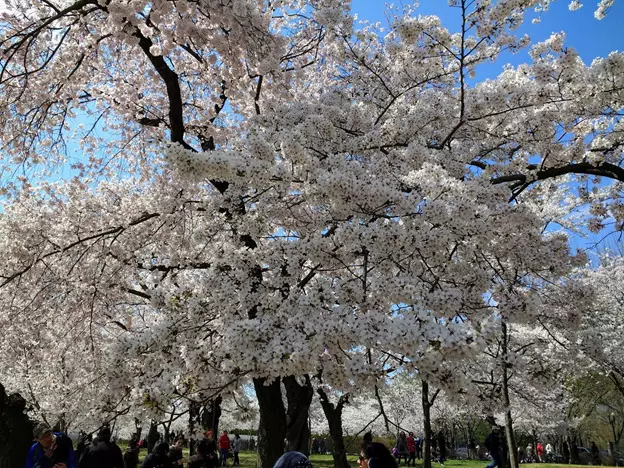 20 മിനിറ്റ് നടക്കുമ്പോഴേക്കും പൂത്തുലഞ്ഞ മരങ്ങള് കണ്ടു തുടങ്ങി. നേരിയ പിങ്ക് നിറമുള്ള പൂക്കള് ഇലകളില്ലാതെ മരച്ചില്ലകളെ മൂടി പൊതിഞ്ഞ് നില്ക്കുന്നു. പ്രധാനമായും തടാകതീരത്താണ് ഇവയുടെ സ്ഥാനം കിലോമീറ്റര് നീണ്ടുകിടക്കുന്ന ഈ പൂപ്പന്തലിന് അടിയില്ക്കൂടി നടക്കുമ്പോള് നമ്മള് സ്വപ്നലോകത്താണോ എന്ന് സംശയിച്ചു പോകും. ആദ്യം സമ്മാനിക്കപ്പെട്ട മരങ്ങളില് 20% മാത്രമേ ഇന്ന് ബാക്കിയുള്ളു. ചത്തു പോയ മരങ്ങളുടെ സ്ഥാനത്ത് ഇതേ ഇനത്തില്പ്പെട്ട പുതിയ മരങ്ങള് വെച്ച് പിടിപ്പിച്ചു. 1981 ടോക്കിയോയിലെ ചെറി മരങ്ങള് വെള്ളപ്പൊക്കത്തില് നശിച്ചു പോയപ്പോള് ഇവിടെ നിന്ന് ചെടിയുടെ കമ്പുകള് കൊടുത്തയച്ചിരുന്നു. 1958ല് ജാപ്പനീസ് ഗവണ്മെന്റ് അമേരിക്കന് ജനതക്കായി ഒരു പഗോഡ (പലതട്ടുകളായുള്ള ബുദ്ധ ക്ഷേത്രത്തിന്റെ മാതൃക) സമ്മാനിച്ചത് ഈ മരങ്ങള്ക്കിടയില് ഒരു ഭാഗത്ത് കാണാം.