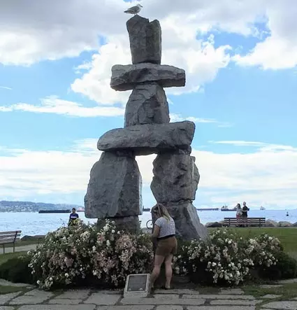 ഇനുക്ഷക്ക് (Inukshuk) എന്ന് പേരുള്ള ഒരു ശില്പം ബീച്ചില് ഒരു ഭാഗത്ത് കാണാം. ഇത് ഇനു (Inuit) എന്ന ആദിമ ഗോത്രക്കാര് സൗഹൃദത്തിനെയും ആതിഥ്യമര്യദയെയും പ്രതീകവത്കരിച്ചു കൊണ്ട് എക്സ്പോ 86 ഇവിടെ നടന്നപ്പോള് നിര്മിച്ചു നല്കിയതാണ്. അമേസിങ്ങ് ലാഫ്റ്റര് (A-Mazing Laughter) എന്ന പേരിലുള്ള ഒരു കലാശില്പം ഇവിടെ ഇംഗ്ലീഷ് ബേ കടല്ത്തീരത്തിന് അടുത്തായി കാണാം. യൂമിന് ജുന് എന്ന ചൈനീസ് കലാകാരന് സ്വന്തം മുഖം മാതൃകയായി ഉപയോഗിച്ച്, കണ്ണടച്ചു കൊണ്ട് പൊട്ടിച്ചരിക്കുന്ന കുറേ മനുഷ്യരുടെ ഒരു കൂട്ടം സൃഷ്ടിച്ചിരിക്കുകയാണിവിടെ. യാഥാര്ഥ്യത്തിന് നേരെ കണ്ണടച്ചു കൊണ്ട് പുറംകാഴ്ചകളില് അഭിരമിച്ച് നടക്കുന്ന മനഷ്യരെ കണ്ട് ചിരിക്കുകയാണ് അവര്.