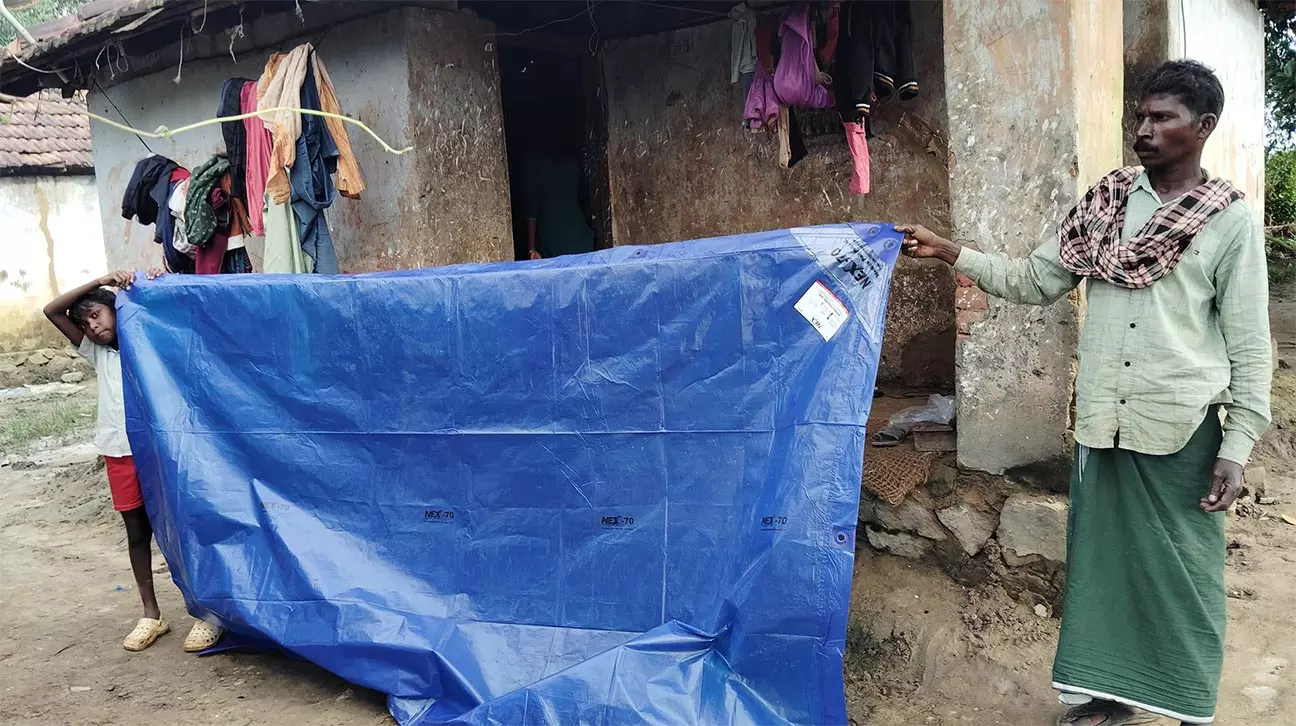 | കല്ലൂര് പുഴകുനി ഊരിലെ വീടിനുമുന്നില് ക്യാമ്പില്നിന്ന കിട്ടിയ ടാര്പോളിന് ഷീറ്റുമായി കുട്ടനും മകനും.