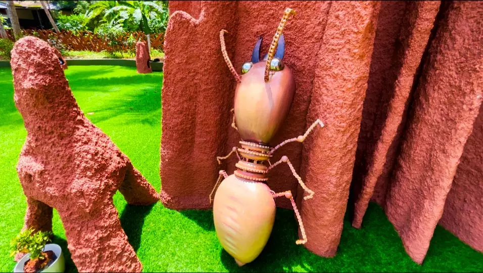 2018 ലാണ് വീട് നിര്മാണം ആരംഭിച്ചത്. ആദ്യത്തെ ഒരു വര്ഷം സാധാരണയായി ചെയ്യുന്ന കാര്യങ്ങളൊക്കെയാണ് ചെയ്തത്. പിന്നീട് കൊറോണ കാരണം പാതിവഴിയില് പണി നിര്ത്തേണ്ടി വന്നു. ഏകദേശം ഒരു വര്ഷത്തിനുശേഷം ചിതല്പ്പുറ്റിന്റെ പണി പുനരാരംഭിച്ചു. ചിതല്പ്പുറ്റാകുമ്പോള് ചിതല് വേണമല്ലോ. അതുകൊണ്ട് തന്നെ അതിഥികളെ വരവേല്ക്കാന് വീടിന്റെ മുന്വശത്ത് തന്നെ ഒരു ചിതലിന്റെ രൂപവും സൃഷ്ടിച്ചു. അതും വളരെ വ്യത്യസ്തമായ രീതിയിലാണ് ചെയ്തത്. ബുള്ളറ്റിന്റെ ടാങ്ക് ഉപയോഗിച്ചാണ് ഉടല് നിര്മിച്ചത്. കൈകാലുകള് ബുള്ളറ്റിന്റെ ചെയിന് ഉപയോഗിച്ചും. അതുപോലെ വരാന്തയില് നിന്ന് അകത്ത് പ്രവേശിക്കുവാനുള്ള പ്രധാന വാതിലും ചിതലരിച്ചത് പോലെയാണ് ഡിസൈന് ചെയ്തിരിക്കുന്നത്.