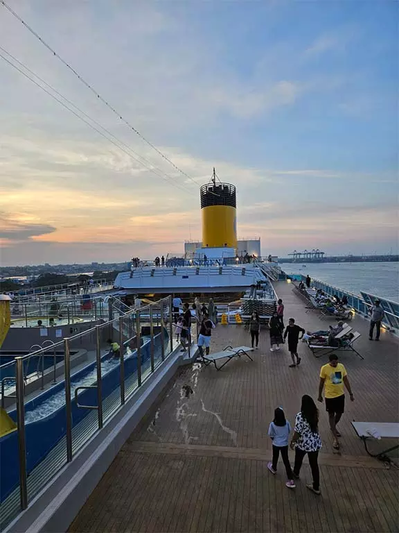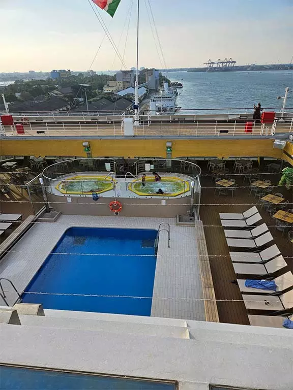 ''കപ്പല് തീരം വിടുന്നത് കാണണ്ടേ?'' ഞങ്ങള് ചോദിച്ചു. വേണ്ടെന്നു മകള്. അവസാനം, മകള് തന്നെ ജയിച്ചു. സൂര്യാസ്തമയം കാണാമെന്ന ആഗ്രഹവും പാതിവഴിക്കുപേക്ഷിച്ചു ഞങ്ങള് റൂമില് പോയി നീന്താന് തയ്യാറായി. സ്വിം സ്യൂട്ടുമണിഞ്ഞു ആദ്യം ജക്കൂസിയിലിറങ്ങി. ഒന്ന് രണ്ടിടത്തതായി വെള്ളം പതഞ്ഞു പൊങ്ങുന്ന രണ്ട് ജക്കൂസികള് പത്താം നിലയുടെ പൂളിനടുത്തുണ്ടായിരുന്നു. നല്ല ഇളം ചൂട് വെള്ളം. തീരെ ചെറിയ കുട്ടികള്ക്കുള്ള ലൈഫ് ജാക്കറ്റ് അടുത്തുള്ള സ്റ്റാന്ഡില് തൂക്കിയിട്ടിരുന്നു. സ്റ്റെപ്പിന് താഴെ നിലത്തു വീഴുന്ന വെള്ളം അപ്പപ്പോള് ഒരാള് തുടച്ചു മാറ്റിക്കൊണ്ടിരുന്നു. കുറച്ച് കഴിഞ്ഞപ്പോള് മകള് പൂളിലിറങ്ങിയെങ്കിലും വെള്ളത്തിന് ഉപ്പുരസമാണെന്ന് പറഞ്ഞു മകള് ജക്കൂസിയിലേക്ക് തിരിച്ചു പോയി.