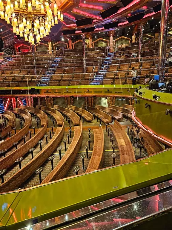 'ഇത് പിടിച്ചു വലിച്ചു തുറക്കുമ്പോള് കടല് വെള്ളമെങ്ങാനും ഇരമ്പി വരുമോ' എന്ന ചിന്ത ഒരു നിമിഷം എന്റെ മനസ്സിലൂടെ കടന്നുപോയി. ഭാഗ്യത്തിന്, അതൊരു റെസ്റ്റോറന്റായിരുന്നു. ഭംഗിയായി സജ്ജീകരിച്ചിരിക്കുന്ന അനേകം മേശകള്. എല്ലാ മേശകള്ക്ക് മുകളിലും വെട്ടിത്തിളങ്ങുന്ന ഗ്ലാസ്സുകളും സ്പൂണും ഫോര്ക്കും മറ്റുമുണ്ടായിരുന്നു. രണ്ടു തട്ടിലായി വ്യാപിച്ചു കിടക്കുന്ന റെസ്റ്റോറന്റില് മുകളിലെ നിലയില് നിന്നുള്ള രാജകീയമായ വളഞ്ഞ സ്റ്റെപ്പുകളും കണ്ടു. എന്നാല്, അതിനകത്ത് ആരുമുണ്ടായിരുന്നില്ല. അതിലൂടെ അപ്പുറത്ത് കടന്നാല് തീയറ്റര് കാണാമായിരിക്കുമെന്ന പ്രതീക്ഷയില് നടന്നു. കൂട്ടത്തില് റെസ്റ്റോറന്റിന്റെ അകം വിശദമായി കാണാമല്ലോ എന്ന ഉദ്ദേശവുമുണ്ടായിരുന്നു. റെസ്റ്റോറന്റില് നിന്നു പുറത്തേക്ക് കടന്നപ്പോഴും തീയറ്ററിന്റെ പൊടി പോലും കിട്ടിയില്ല. കപ്പലിന്റെ ക്രൂ എന്നു തോന്നിപ്പിക്കുന്ന രണ്ടാളുകളെ കണ്ടപ്പോള് തീയറ്ററെവിടെയാണെന്ന് അന്വേഷിച്ചു.