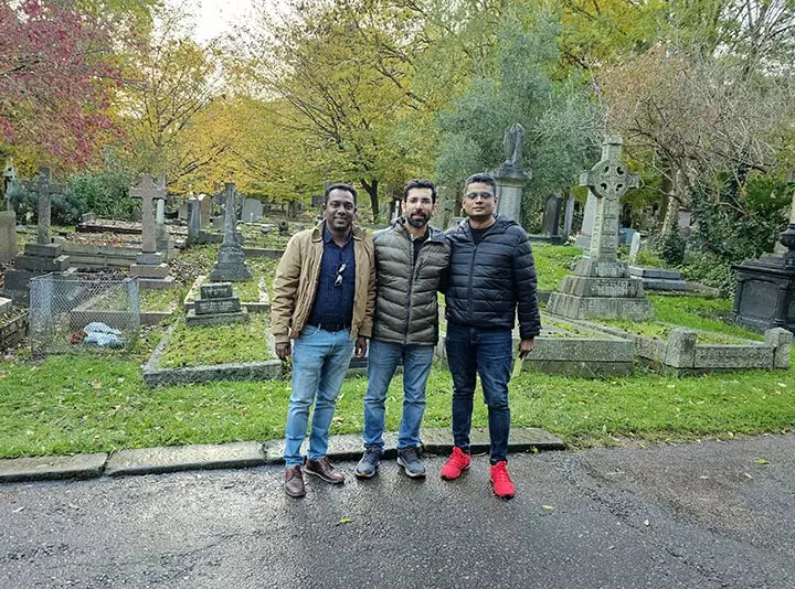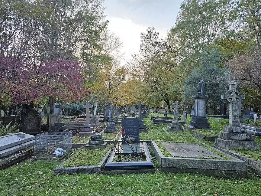 അണ്ടര്ഗ്രൗണ്ട് ടൂബ് ട്രെയിന്ന്റെ നോര്തേണ് ലൈനില് കയറി ഹൈഗേറ്റ് സ്റ്റേഷനിലിറങ്ങി, അവിടെ നിന്നും ഊബര് ടാക്സിയെടുത്ത് നേരെ സെമിത്തേരിയിലേക്ക്.