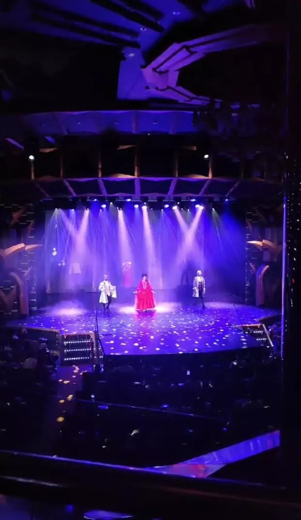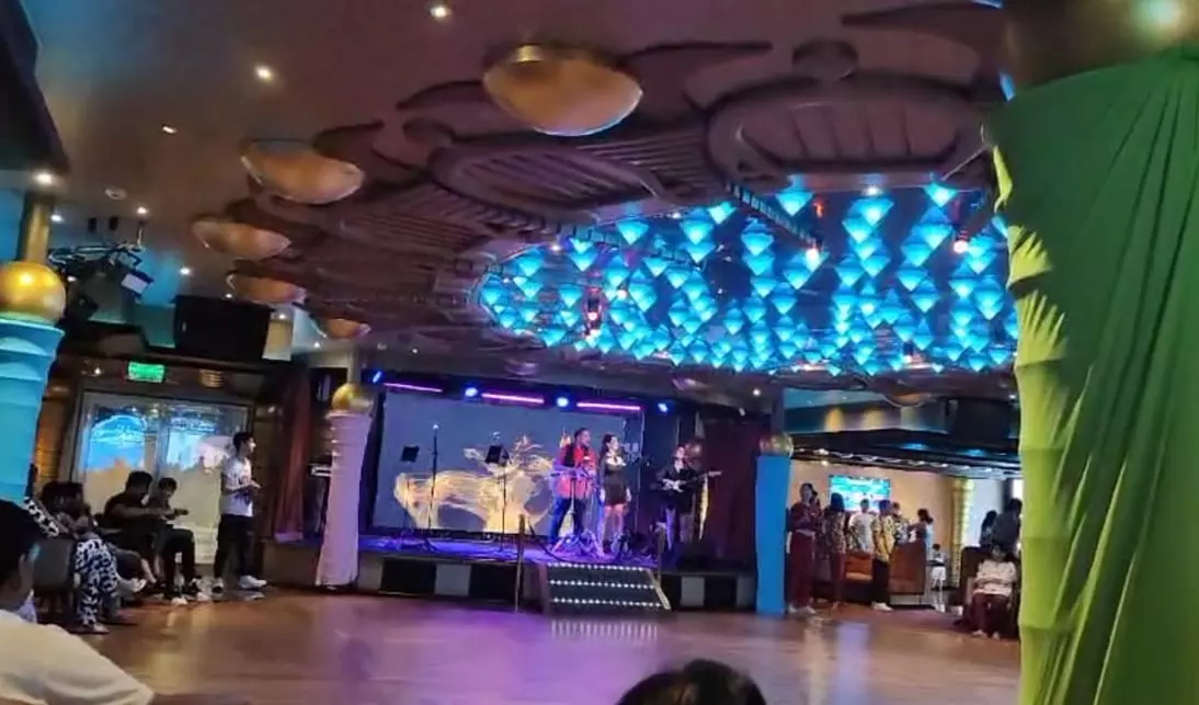 മാളുകളിലെപ്പോലെ മുകളിലുള്ള നിലയിലുള്ളവര്ക്കും കാണാവുന്ന രീതിയിലാണ് എല്ലാ സ്റ്റേജുകളും സജ്ജീകരിച്ചിരിക്കുന്നത്. മികച്ച ലൈറ്റിങ്ങും തെന്നി നീങ്ങുന്ന പാറ്റേണ് ലൈറ്റുകളും ഉളള വേദിയുടെ പശ്ചാത്തലം ചുറ്റും ചില്ലിട്ട സുവര്ണ്ണ ലിഫ്റ്റുകളാണ്. കീ ബോര്ഡിന്റെ അകമ്പടിയോട് കൂടി ഗായകന്റെ മൈക്കിലൂടെ നിര്ഗളിക്കുന്ന ഗസലുകളും ബോളീവുഡ് ഗാനങ്ങളും. ചുറ്റുമിട്ട സോഫാസീറ്റുകളിലിരുന്നു അവയ്ക്കനുസരിച്ച് അറിയാതെ താളം പിടിച്ചു പോകുന്ന കേള്വിക്കാര്. രാത്രിയെ പകലാക്കുന്ന മഹാത്ഭുതം. കപ്പലിന്റെ വിവിധ വേദികളില് വ്യത്യസ്തമായ പരിപാടികളുണ്ടെന്ന് അറിയാമായിരുന്നെങ്കിലും ഇത് ഉറങ്ങാനുള്ള സമായമാണെന്ന് മനസ്സിനെ പറഞ്ഞു പഠിപ്പിച്ചു കൊണ്ട് കാബിനിലേക്ക് നടന്നു. രാത്രി മുഴുവന് എഴുന്നേറ്റിരിക്കുന്ന ഈ യാത്രക്കാര് എപ്പോഴായിരിക്കും ഉറങ്ങുന്നതെന്ന ശങ്ക മാത്രം അവശേഷിച്ചു.