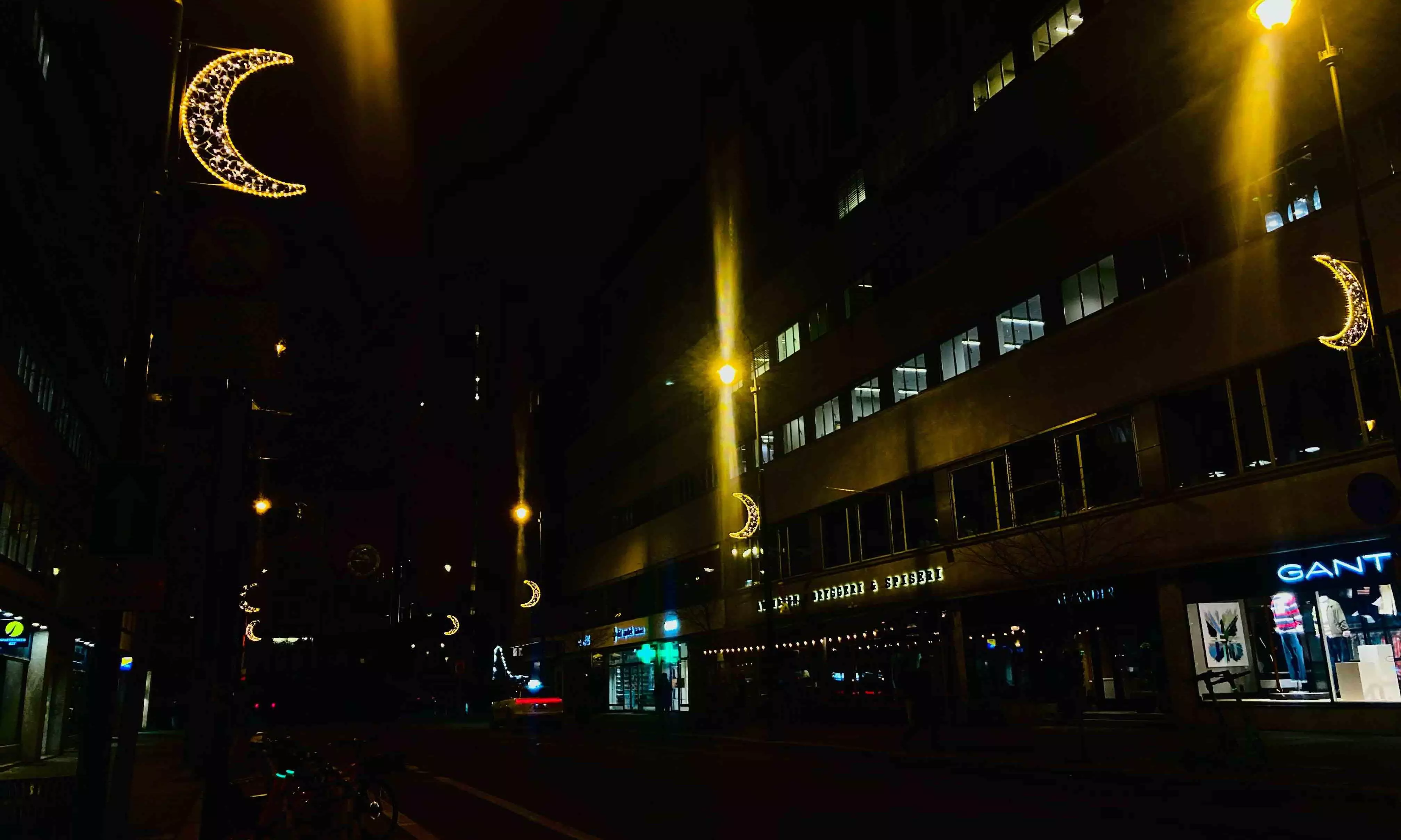 ഓസ്ലോ സിറ്റി ഹാളിന് മുന്നിലെ റമദാൻ വിളക്കുകൾ. ഈ സ്ട്രീറ്റിന് തൊട്ടപ്പുറത്താണ് നോർവീജിയൻ പാർലമെന്റ് സ്ഥിതി ചെയ്യുന്നത്