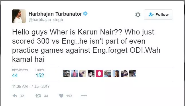 കരുണ് നായരെ ഉള്പ്പെടുത്തിയില്ല; സെലക്ടര്മാരെ വിമര്ശിച്ച് ഹര്ഭജന്റെ ട്വീറ്റ്കരുണ് നായരെ ഉള്പ്പെടുത്തിയില്ല; സെലക്ടര്മാരെ വിമര്ശിച്ച് ഹര്ഭജന്റെ ട്വീറ്റ്