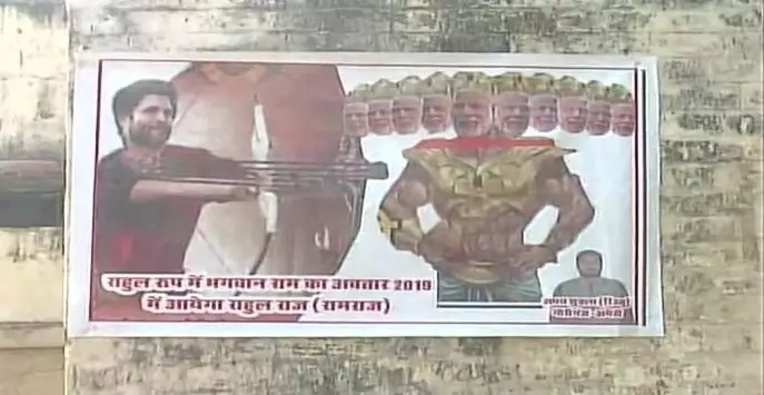 |കോണ്ഗ്രസ് അധ്യക്ഷന് രാഹുല് ഗാന്ധിയെ രാമനായും പ്രധാനമന്ത്രി നരേന്ദ്ര മോദിയെ രാവണനായും ചിത്രീകരിച്ച് അമേഠിയില് പോസ്റ്റര്.