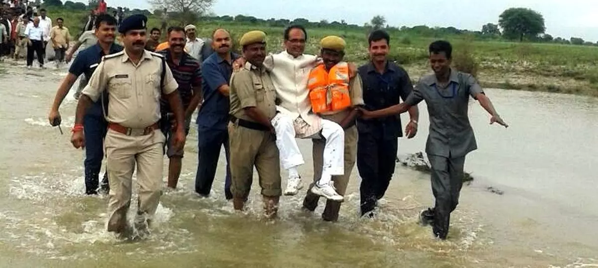 |മധ്യപ്രദേശിലെ പ്രളയബാധിത പ്രദേശങ്ങള് സന്ദര്ശിക്കാന് മുഖ്യമന്ത്രിയും ബിജെപി നേതാവുമായ ശിവരാജ് സിങ് ചൗഹാന് എത്തിയത് പൊലീസുകാരുടെ തോളിലേറി.