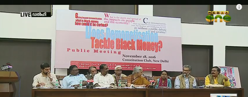 പബ്ലിക് ഫിനാന് അക്കൌണ്ടബിലിറ്റി, സെന്റര് ഫോര് ഫിനാന്സ്യല് അക്കൌണ്ടബിലിറ്റി എന്നീ കൂട്ടായ്മകളാണ് ഡല്ഹിയില് പൊതു യോഗം സംഘടിപ്പിച്ചത്. നോട്ട് നിരോധം കൊണ്ട് കള്ളപ്പണം ഇല്ലാതാക്കാനുമോ എന്ന വിഷയത്തില് വിവിധ രാഷ്ട്രീയ നേതാക്കളും സാമൂഹ്യ-വ്യാവസായിക-തൊഴിലാളി സംഘടനകളുടെ നേതാക്കളും സംസാരിച്ചു. കേന്ദ്ര സര്ക്കാരിന്റെ ദീശാബോധമില്ലാത്ത തീരുമാനം കാരണം സ്വന്തം പണം വാങ്ങാന് ജനങ്ങള് ഊണു ഉറക്കവുമില്ലാതെ ക്യൂ നില്ക്കുന്ന അവസ്ഥ പൌരവകാശ ലംഘനമായേ കണക്കാക്കാനാകൂ എന്ന് നേതാക്കള് വ്യക്തമാക്കി.