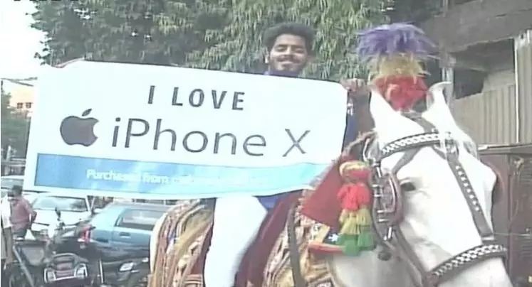 വിപണിയിലെ ഏറ്റവും പുതിയ മോഡല് മൊബൈല് ഫോണ് സ്വന്തമാക്കുക എന്നത് ഒരുപാടുപേരുടെ സ്വപ്നമാണ്. അതുകൊണ്ടുതന്നെ ഫോണ് വാങ്ങാന് പോകുന്നതില് പ്രത്യേകിച്ച് പുതുമയൊന്നുമില്ല. എന്നാല് ഒരു യുവാവ് ഐ ഫോണ് X സ്വന്തമാക്കാനുള്ള യാത്ര ആഘോഷമാക്കി മാറ്റി. മുംബൈ സ്വദേശിയായ യുവാവ് കുതിരപ്പുറത്താണ് ഫോണ് വാങ്ങാന് പോയത്. ഐ ലവ് ഐ ഫോണ് എന്ന പ്ലക്കാര്ഡുമേന്തി ബാന്ഡ് മേളത്തിന്റെ അകമ്പടിയോടെയായിരുന്നു യാത്ര.