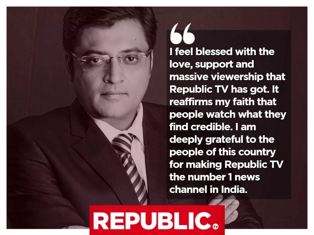 |ഇപ്പോൾ പുറത്തുവന്ന റേറ്റിംഗ് ഫലത്തിൽ ആദ്യ നാലുസ്ഥാനങ്ങളിൽ നിൽക്കുന്ന ചാനലുകൾക്ക് എല്ലാം കൂടി റിപ്പബ്ലിക്കിന്റെ റേറ്റിംഗേ ഉള്ളൂ.