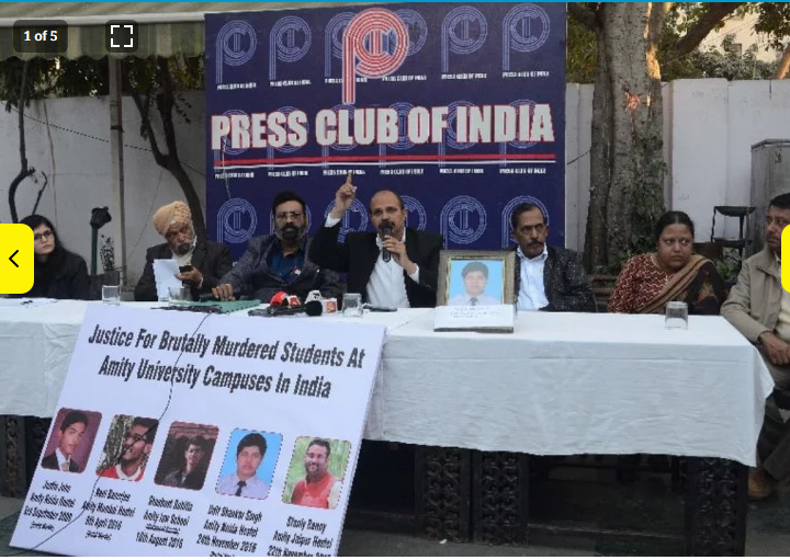 അമിറ്റി യൂണിവേഴ്സിറ്റിയില് വിവിധ കാലയളവില് കൊല്ലപ്പെട്ട അഞ്ച് വിദ്യാര്ത്ഥികളുടെ രക്ഷിതാക്കളാണ് ഡല്ഹിയില് ഒരുമിച്ചത്. തങ്ങളുടെ മക്കള്ക്ക് നീതിവേണമെന്നും യൂണിവേഴ്സിറ്റിക്ക് എതിരെ നടപടി വേണമെന്നും രക്ഷിതാക്കള് ആരോപിച്ചു.