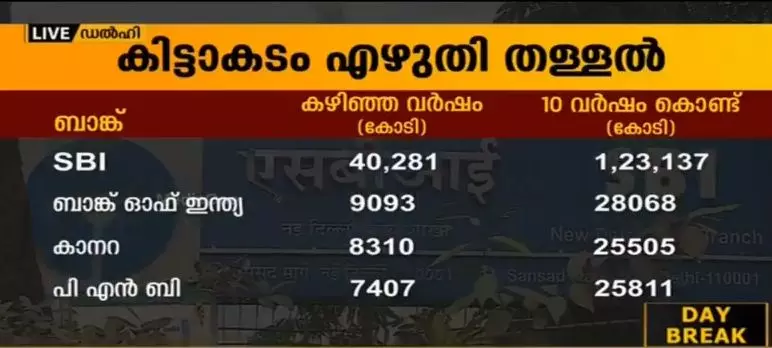 പൊതുമേഖലാ ബാങ്കുകളാണ് ഇക്കാര്യത്തില് മുന്നില്. സ്റ്റേറ്റ് ബാങ്ക് ഓഫ് ഇന്ത്യ കഴിഞ്ഞ സാമ്പത്തിക വര്ഷം എഴുതി തള്ളിയത് 40,281 കോടി, പത്ത് വര്ഷം കൊണ്ട് എഴുതി തള്ളിയത് 1,23,137 കോടി രൂപ. ബാങ്ക് ഓഫ് ഇന്ത്യ കഴിഞ്ഞ വര്ഷം 9093 കോടിയും പത്ത് വര്ഷത്തിനിടെ 28,068 കോടിയും എഴുതി തള്ളിയെന്ന് കണക്കുകള് വ്യക്തമാക്കുന്നു, കാനറാ ബാങ്ക്, പഞ്ചാബ് നാഷണല് ബാങ്ക് തുടങ്ങിയവയാണ് ഈ പട്ടികയില് മൂന്നും നാലും സ്ഥാനങ്ങളില്. സ്വകാര്യ ബാങ്കുകള് ആകെ കഴിഞ്ഞ സാമ്പത്തിക വര്ഷം 23928 കോടി രൂപ എഴുതി തള്ളിയത്. തൊട്ടുമുമ്പത്തെ വര്ഷം 13119 കോടി ആയിരുന്നിടത്താണിത്.
