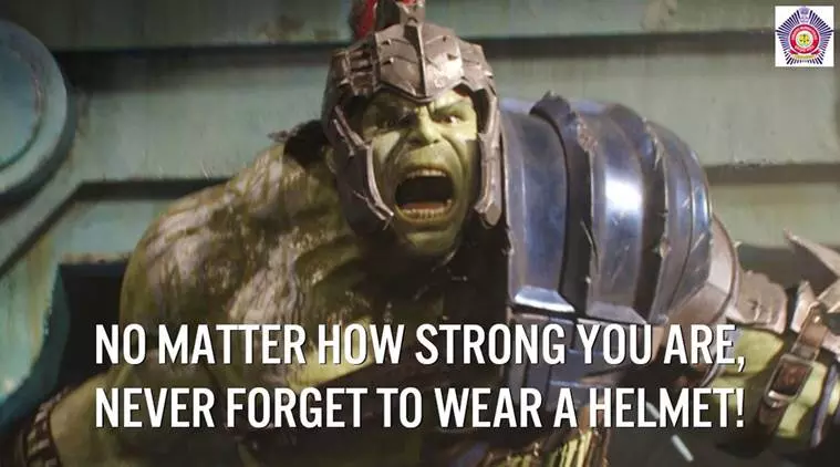 നിങ്ങള് എത്ര ശക്തരാണ് എന്നതിന് പ്രസക്തിയില്ല. ഹെല്മറ്റ് ധരിക്കാന് മറക്കാതിരിക്കുക എന്നാണ് കാമ്പയിനിന്റെ ഭാഗമായി നല്കിയിരിക്കുന്ന കാപ്ഷന്. ഹള്ക്കിന്റെ യഥാര്ത്ഥ രൂപം ഹെല്മറ്റോ, ഷര്ട്ടോ ധരിക്കുന്നില്ലെങ്കിലും, ഈ ചിത്രം എടുത്തിരിക്കുന്നത് ഹള്ക്ക് കഥാപാത്രമായി വരുന്ന തോര് രഗ്നാരോക് എന്ന സിനിമയില് നിന്നാണ്.