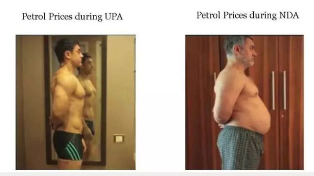 യുപി.എ, എന്.ഡി.എ കാലങ്ങളിലെ ഇന്ധന വില താരതമ്യം ചെയ്യാന് ആമിര് ഖാന്റെ ചിത്രങ്ങളാണ് കോണ്ഗ്രസിന്റെ സോഷ്യല് മീഡിയ വിഭാഗം മേധാവി ദിവ്യ സ്പന്ദന ട്വീറ്റില് ഉപയോഗിച്ചത്. മെലിഞ്ഞ ആമിറിനെ യു.പി.എ കാലത്തെ ഇന്ധനവിലയായും കുടവയറുള്ള ആമിറിനെ എന്.ഡി.എ കാലത്തെ വിലയായും താരതമ്യം ചെയ്താണ് ദിവ്യ സ്പന്ദനയുടെ ട്വീറ്റ്. ട്വീറ്റിനെ അനുകൂലിച്ചും എതിര്ത്തും നിരവധി പേര് മറുപടിയുമായെത്തി.